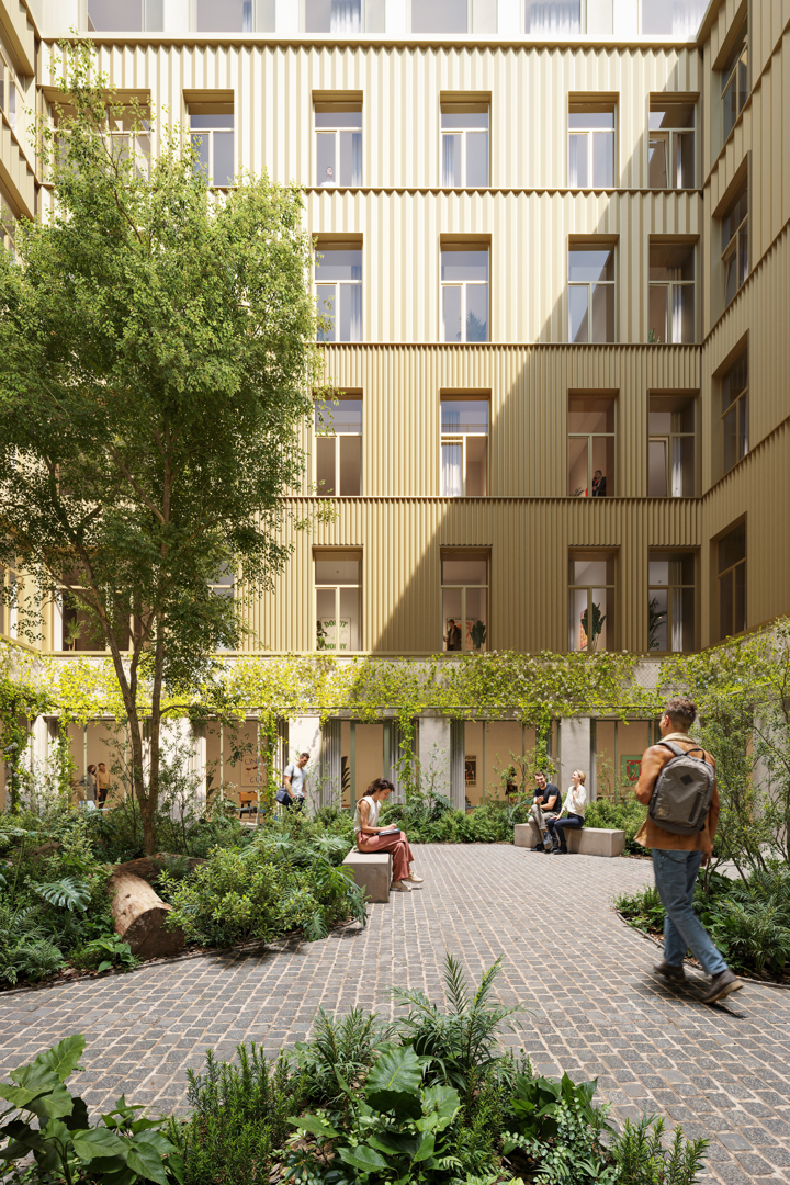 Een tweede ontwerphefboom ligt in het hart van het gebouw: het bestaande atrium met glazen dak wordt niet louter een interne lichtput, maar een geactiveerde plek die het woonprogramma organiseert. “We gaan het atrium opentrekken tot een levendige, groene buitenruimte, waar studenten elkaar kunnen ontmoeten en genieten van rust. Alle gemeenschappelijke ruimtes komen daarop uit,” aldus Cockx. Door die collectieve functies rond het atrium te scharen, ontstaat een duidelijke interne oriëntatie én een microklimaat dat de residentie een eigen ‘buitenkamer’ geeft in de dichte binnenstad. Het atrium fungeert daarbij tegelijk als ontmoetingsplek en als ruimtelijke schakel tussen de verschillende lagen van het voormalige kantoorgebouw.