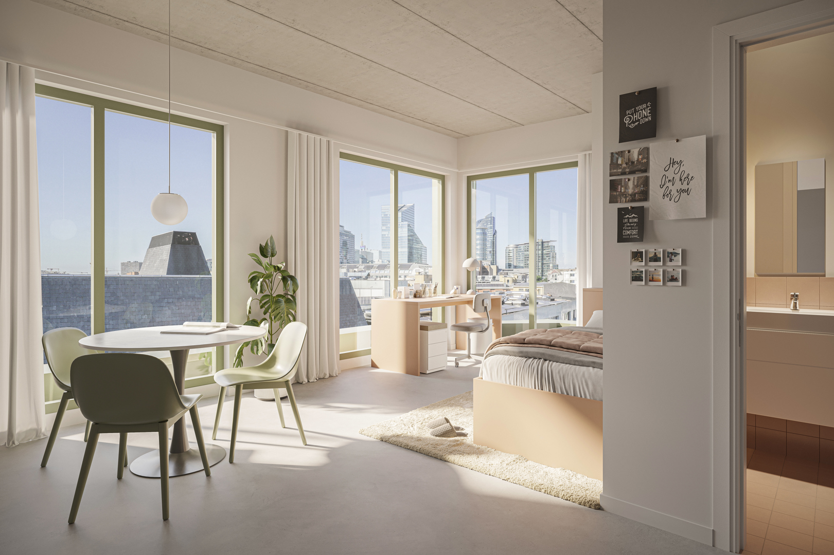 Het Antwerpse ontwerpbureau LOW Architecten vertrekt vanuit de kwaliteiten van de bestaande ruwbouw: hoge plafonds, royale lichtinval en een planlogica die herverkaveling toelaat zonder het karakter te verliezen. Het programma wordt uitgesplitst in 90 kamers (18–26 m²) en 129 studio’s (25–47 m²), telkens met eigen sanitair; de studio’s krijgen bovendien een kitchenette. Die verdeling koppelt compacte privékamers aan zelfstandiger studio’s, terwijl een pakket van 775 m² gemeenschappelijke ruimtes—keukens, zitplekken en studiezalen—de residentie als collectief woonmilieu moet laten werken, ondersteund door een fulltime inwonende conciërge die mee instaat voor beheer en onderhoud.