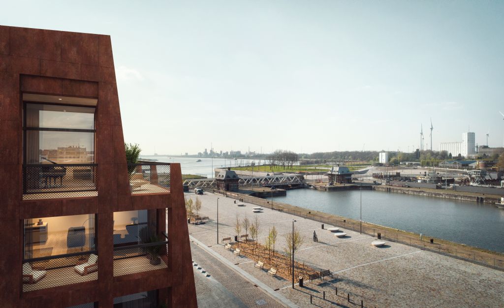 “Bij het ontwerp van het gebouw en de keuze van de materialen hebben we onze inspiratie opgedaan bij de haven en de oude havenkranen. We kiezen voor een speciaal soort staal die erg doen denken aan de industrie die hier vroeger heerste. Het resultaat is een markant gebouw dat uniek zal zijn in het Antwerpse stadsbeeld. Of sterker nog: uniek in het Belgische landschap”, aldus Philip Mortelmans, M2 Architecten.