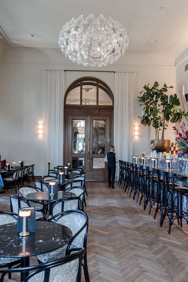 In het volledige restaurant en grand café werd OWAplan toegepast, een naadloos akoestisch plafondsysteem met hoge geluidsabsorptie. Het plafond vangt geluiden op van pratende gasten, verschuivende stoelen en klinkende glazen, waardoor de ruimte ook bij volledige bezetting aangenaam rustig blijft. Bezoekers hoeven hun stem niet te verheffen om elkaar te verstaan, wat bijdraagt aan een ontspannen sfeer.