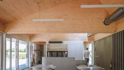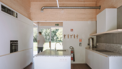 Het ontwerp biedt een helder en nederig antwoord. Binnen de erfstructuur nestelt zich een nieuw volume dat refereert aan het archetype van de schuur. Geen replica, maar een eigentijdse buurtschuur die zich vanzelfsprekend inschrijft in het ensemble. Vijf traveeën, gedefinieerd door een houten spantenstructuur, bakenen keuken, polyvalente ruimte en afzonderlijk bruikbaar sanitair af, en brengen schaal en ritme in het geheel. De plint in betonpanelen draagt het gebouw, terwijl een kroon in CLT het volume afrondt. De gevel in roestbruine houten beplanking en de gegolfde staalplaat van het dak geven het gebouw een robuuste, maar vertrouwde verschijning – utilitair met poëzie.