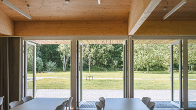 Een klein torenvolume aan de kopzijde markeert het gebouw als collectieve plek. Het is een speels accent, verwijzend naar de erfkapel, dat extra ademruimte biedt aan de zaal en oriëntatie op de site creëert. Gericht geplaatste glaspartijen en een overgedimensioneerde dakoversteek vervagen de grens tussen binnen en buiten. Samen met het landschapsontwerp van Buro Bossaert – met zachte paden, bloemenweides en open plekken – vormt het gebouw een schakelpunt tussen erf, bos en dorp.