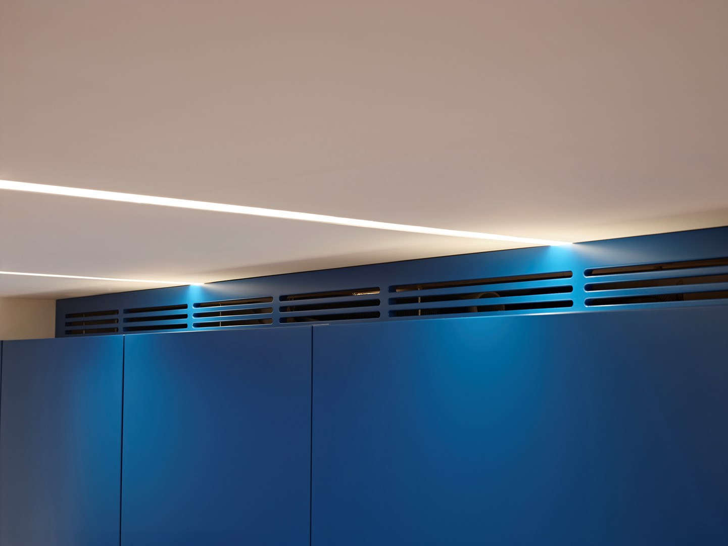 De Healthbox-unit – die zorgt voor de afvoer van vervuilde binnenlucht – zit centraal in de woning ingebouwd, in een kast boven het sanibloc-toilet. Daar komen alle luchtkanalen toe vanuit de badkamer, de keuken en het souterrain toilet. Elke vochtige ruimte heeft andere kleppen, voorzien van de gewenste sensoren voor het specifieke ruimtegebruik. De afvoer van de vervuilde binnenlucht loopt via het dak, om roosters in de achtergevel absoluut te vermijden. Daarvoor loopt één schacht als ruggengraat van het souterrain via de keuken naar de verdieping erboven, waar ze is weggewerkt in een beeldbepalende kast. Moulures rond de koker laten deze schacht perfect blenden in het geheel. In de badkamer is de schacht dan weer geïntegreerd in een nisje achter het bad. Zo wordt deze noodzakelijke afvoerschacht deel van het interieur.