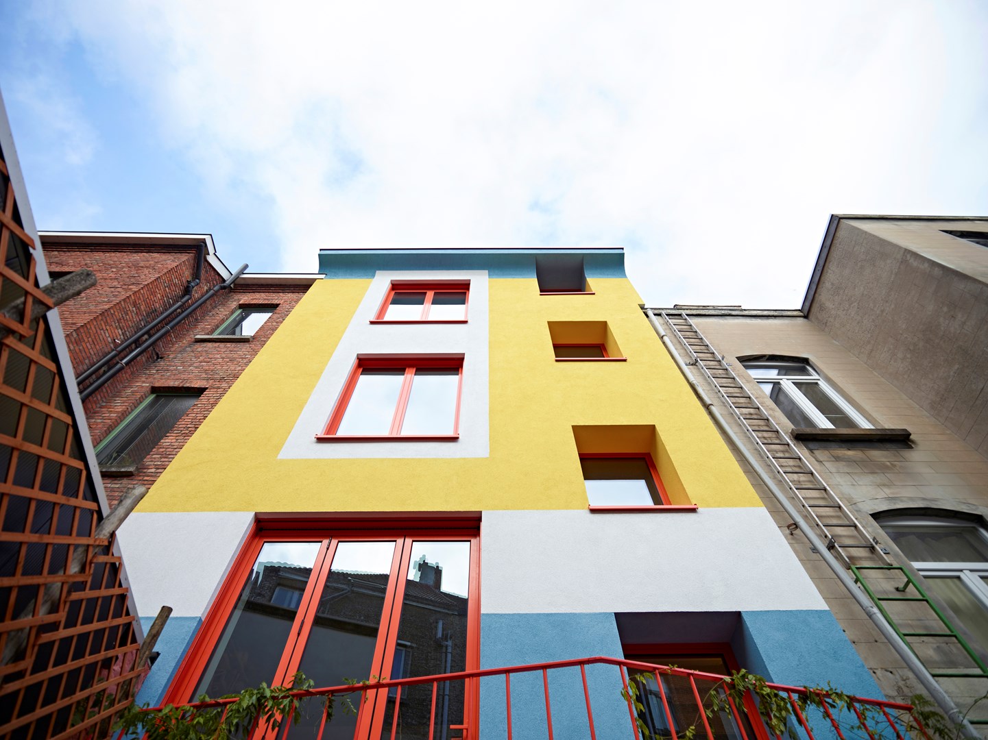 Verder zocht Marge Architecten voor de achtergevel vooral naar een vrolijke uitstraling met een knipoog naar bepaalde kleuren in de voorgevel. Via iteratief ontwerp en met behulp van Photoshop onderzocht de architect diverse kleurenpaletten. Voor de gebouwplint viel de keuze op een blauwe tint, die een beetje vervuiling van de tuin verdraagt. Naar boven toe evolueert die naar zonnig geel. De gebouwkroon, met bolvormige gevelisolatiebepleistering voor een expressieve kromming – herneemt de blauwe kleur.