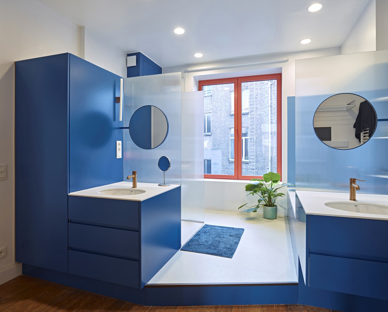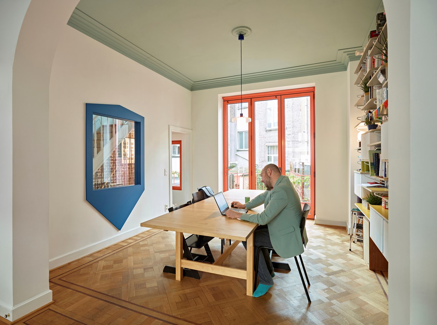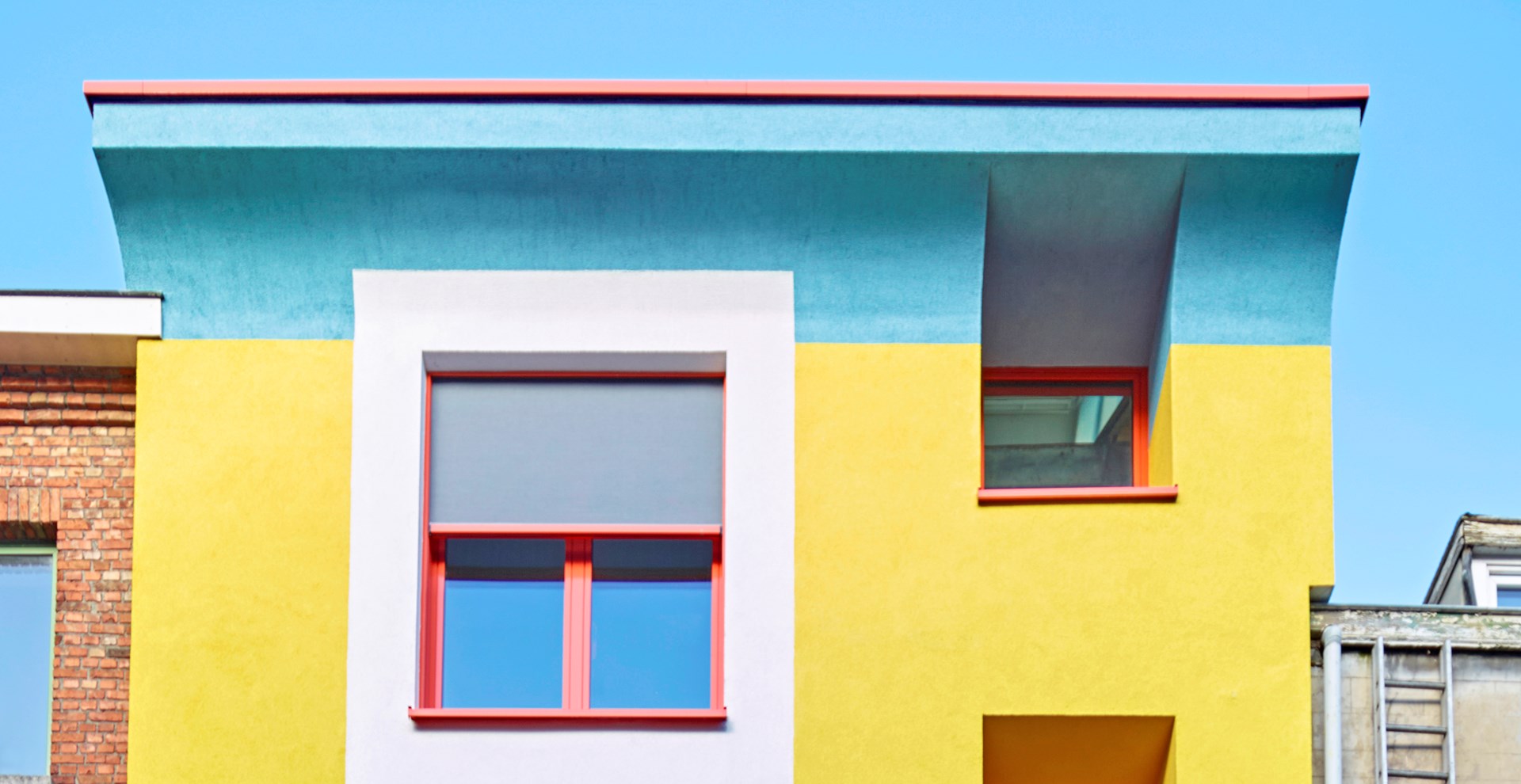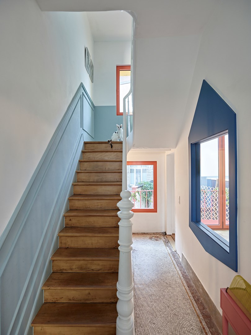 De bandarchitectuur met witte boorden zet de maten van de raamordes visueel gelijk en vormt meteen ook een buffer tussen het geel en het blauw, om te bruuske overgangen te vermijden. “In historische architectuur hebben het schrijnwerk en de balustrades vaak nog een andere kleur. Dat principe volgden we hier ook graag”, vult Thomas aan. “Hiervoor zijn we tussen oranje en zalmroze gestrand.”