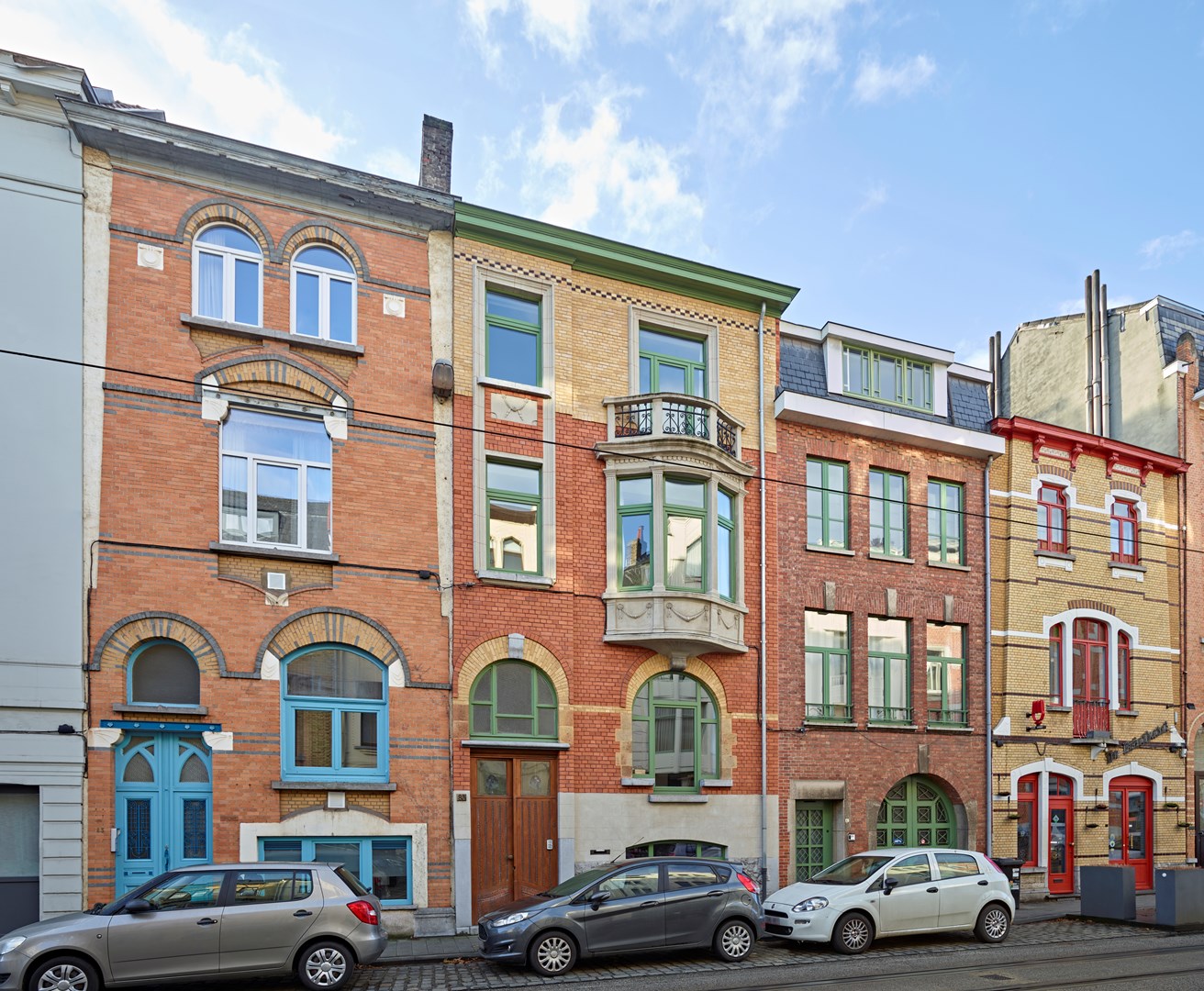 Hoewel niet per se beschermd, heeft de voorgevel van deze rijwoning wel historische waarde en keek Monumentenzorg vanop afstand mee over de schouder. Het polychrome karakter van het huis in het straatbeeld vroeg om een evenwaardige achtergevel. Daar zorgen een slim gebruik van kleur en lineariteit voor een echte eyecatcher. Thomas duidt het architecturale concept: “In de leefruimtes en nachtruimtes hebben we een orde aan grote ramen. De traphal bevat dan weer kleine raampjes. Die twee grootordes vormden een rode draad. Met witte boorden hebben we de twee formaten visueel wat gelijkgetrokken in de achtergevel.”