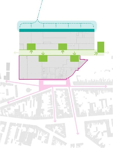 Door de harde ontsluiting van de bedrijvencluster langs het Oosten via de Gaardeniersweg te voorzien, kan aan de zijde van de Bloemekenswijk een aangesloten voorplein worden gecreëerd dat de wijk met het Bloemekenspark verbindt. Het gigantische UCO-gebouw (49.000m²) wordt in twee gesneden door een centrale as die alle bedrijven met elkaar en met het gebouw van het balenmagazijn verbindt. Dit balenmagazijn herbergt de gemeenschappelijke voorzieningen van de sociale economiecluster (bedrijfsrestaurant, opleidingslokalen,…), maar wordt ook voor de bewoners van de wijk opengesteld (sociaal restaurant, afhaalpunt, multifunctionele ruimtes, …).
