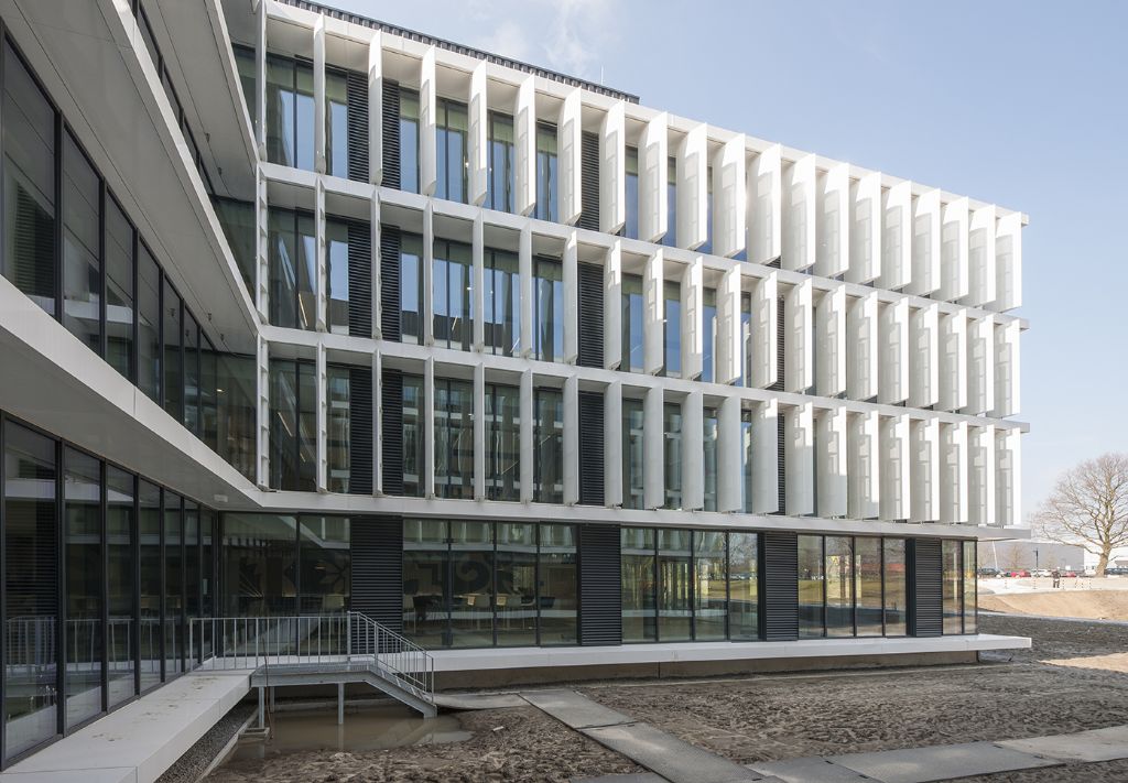 Het kantoorgebouw heeft een industriële look. Die look is ook functioneel: dankzij de inertie van de betonnen structuur zal de warmte in de zomer overdag opgeslagen worden, en ’s nachts opnieuw afgegeven worden.