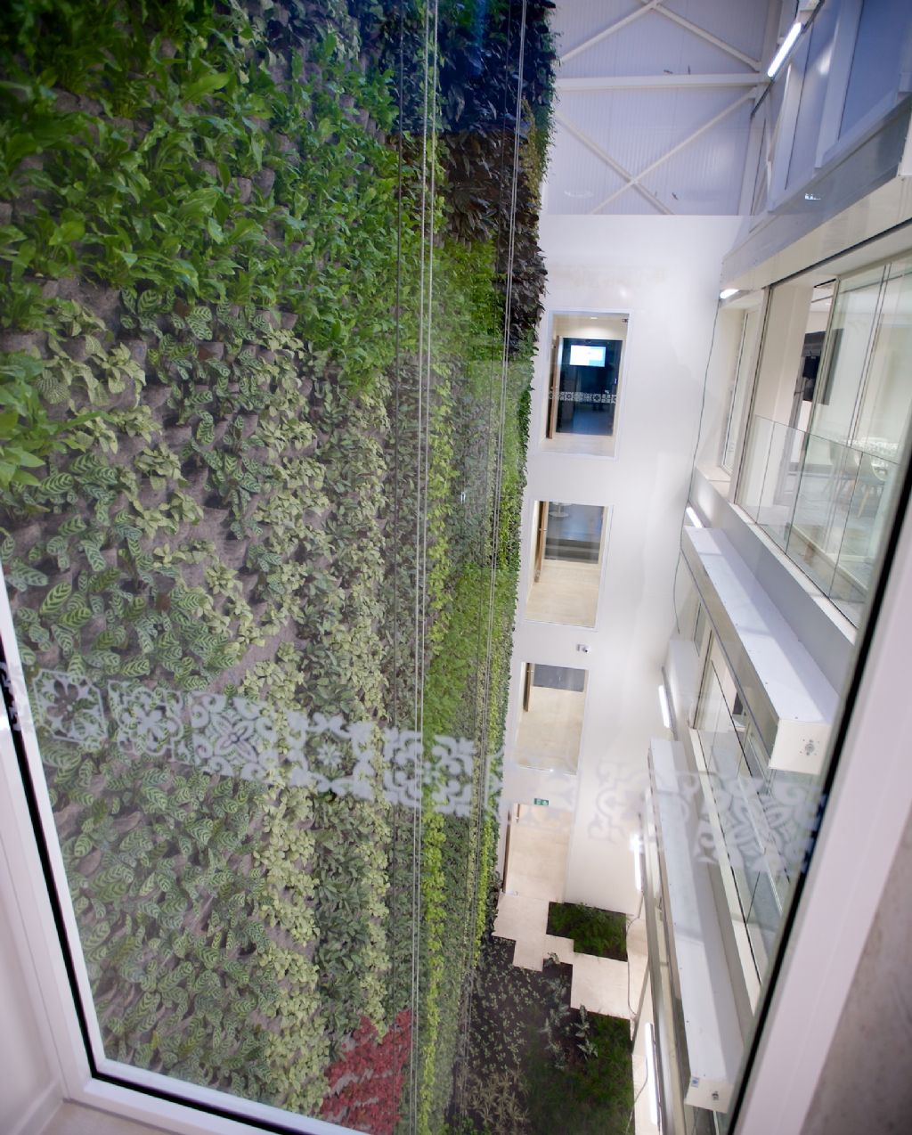 In de schacht voor de natuurlijke nachtventilatie werd een zestien meter hoge verticale tuin gerealiseerd. Die trekt de groene omgeving waarin het gebouw centraal staat door naar binnen. Zowel voor deze binnentuin als de nieuw aangelegde buitentuin werd aandacht besteed aan biodiversiteit. De groene binnenmuur dempt eveneens het geluid in de aanpalende vergaderzalen.