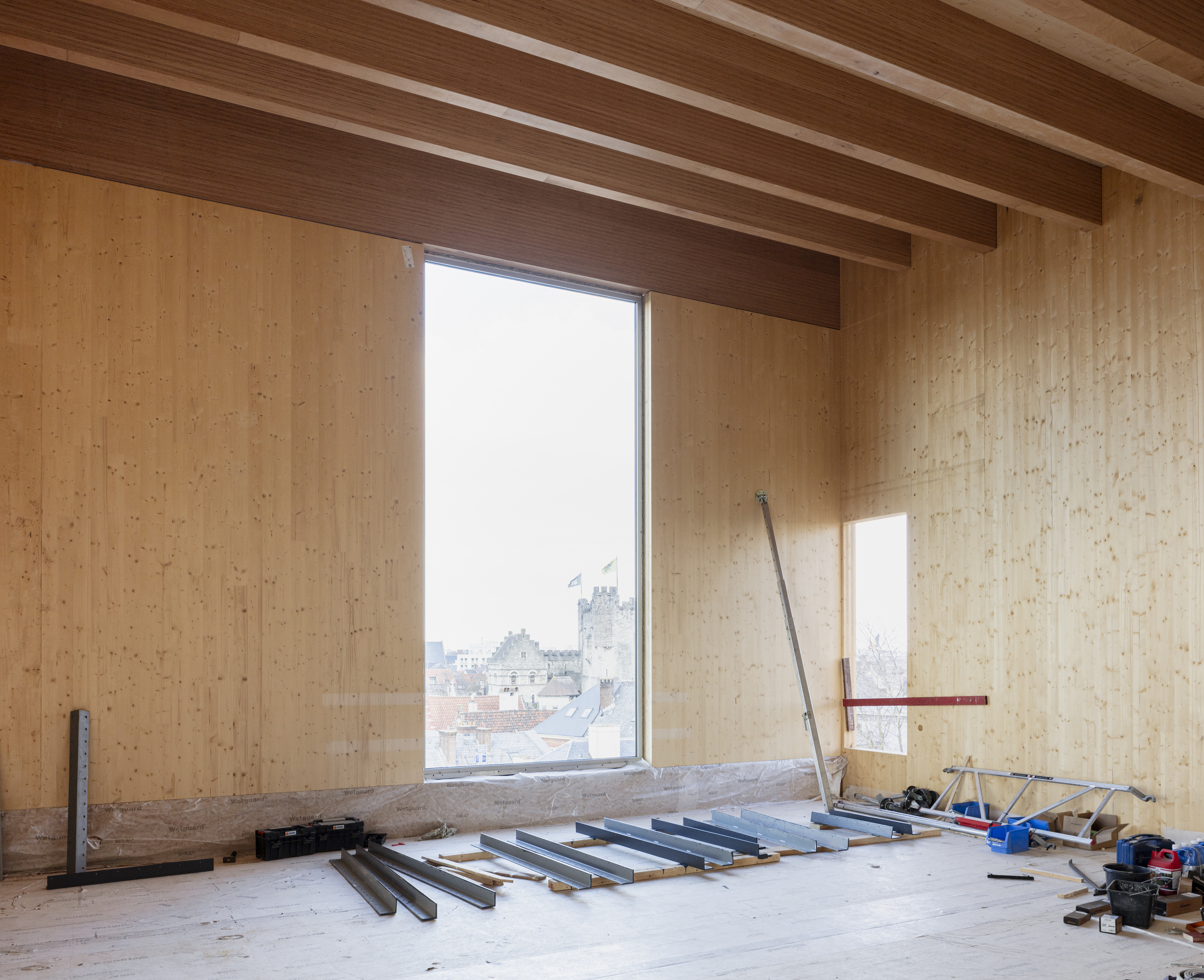 Meiboom op het dak van DING: ruwbouw nieuwe vleugel Design Museum Gent voltooid