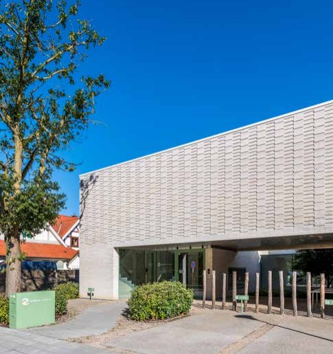 Het gebouw ligt op een hoekperceel in een residentiële wijk met vrijstaande woningen in een groene context. Dat landschappelijke karakter vormde een belangrijke leidraad in het ontwerp. Door twee incisies in het compacte volume aan te brengen, kon het groen dieper het project binnendringen en werd een centrale patio gecreëerd.