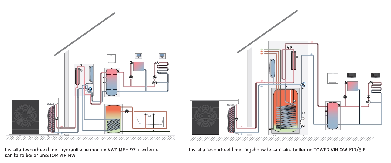 De compacte warmtepomp wordt buiten geïnstalleerd en kan gecombineerd worden met een uniTOWER plus hydraulische toren of een hydraulische module VWZ MEH 97/6. Dankzij de hoge vertrekwatertemperatuur heeft de eindgebruiker geen elektrische bijverwarming nodig voor de bescherming tegen legionella. Bovendien kan de temperatuur van de boiler tot 70 °C bedragen. Bij deze sanitair warmwatertemperatuur en met zijn opslagcapaciteit van 190 liter levert de uniTOWER plus voldoende warm water voor een gezin van vijf.