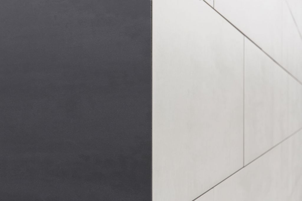 De architecten kozen uiteindelijk voor de combinatie van twee Mosa-tegels, beiden uit de serie Terra Maestricht. Het zijn keramische tegels van het formaat 60 x 120 centimeter, enerzijds in koel zwart en anderzijds in warm porseleinwit. “Voor de specifieke uitstraling die we zochten leek een keramische tegel ons de beste keuze. Als geheel hebben ze een robuuste uitstraling.”