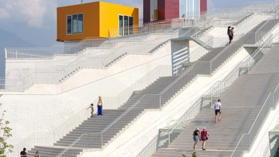 Tirana, Albanië is een bijzonder gebouw rijker. De Pyramid, ooit gebouwd als een monument voor de communistische dictator Enver Hoxha, werd door het Nederlandse architectenbureau MVRDV ingrijpend getransformeerd. De betonnen structuur vormde daarbij het uitgangspunt: de gladde balken waar jongeren vanaf gleden na de val van de dictator toen de Pyramid nog een ruïne was, kregen trappen zodat iedereen over dit gebouw heen kan lopen. Tussen de spanten loopt de openbare ruimte door. Buiten en in het gebouw worden bezoekers verwelkomd door een uitgestrooide verzameling gestapelde gekleurde ruimtes, met daarin cafés, studio's, workshops, festivals en leslokalen waar Albanese jongeren gratis onderwijs krijgen in technologische vakken.