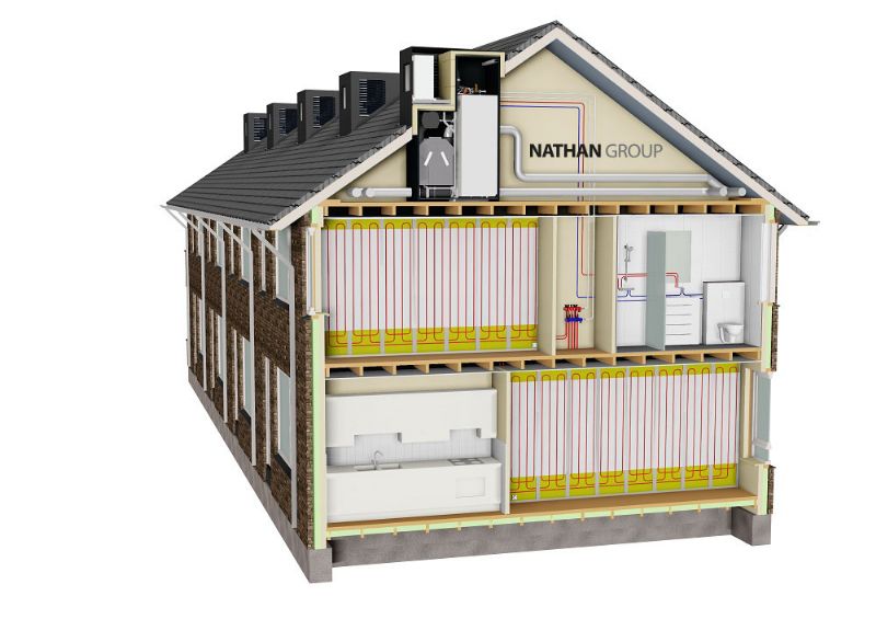 De Energiemodule van de Nathan group is een compacte aanbouw waarin alle installatiecomponenten voor duurzame verwarming en de bereiding van warm tapwater zijn samengebracht tot één product. De prefab energiemodule wordt ‘plug-and-play’ gebouwd, tegen de voor- of achtergevel of in het dak van een woning geplaatst en aangesloten op het afgiftesysteem van de woning. Bij de dakvariant wordt de complete unit op de bovenverdieping geplaatst, waarbij het bovenste gedeelte zich op het dak bevindt.