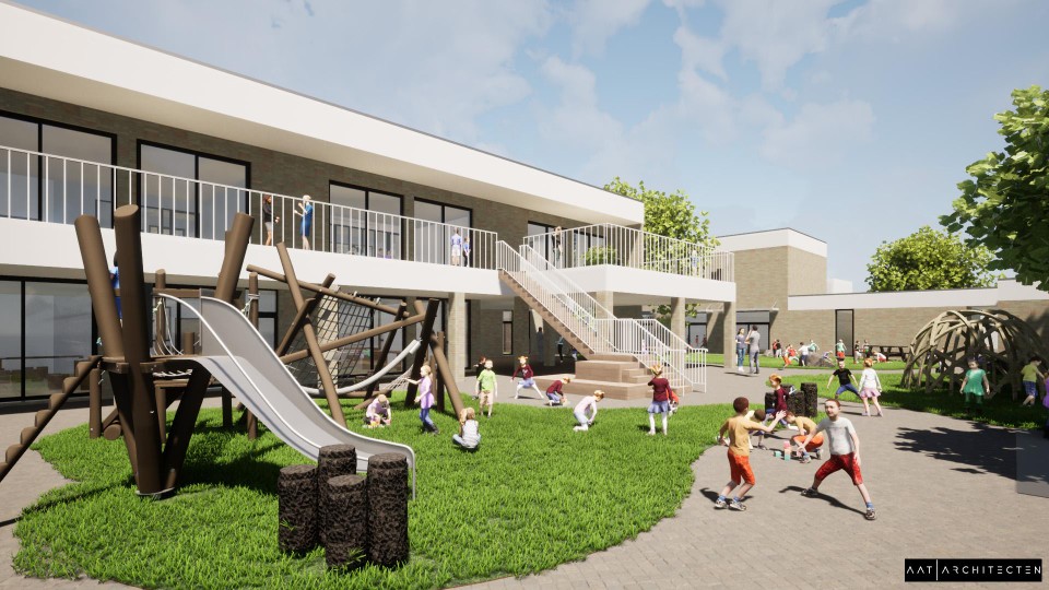 Het architectenbureau werkte binnen de grenzen van de bestaande locatie een gloednieuw compact en modern schoolgebouw uit met twee verdiepingen. Het bestaande schoolgebouw wordt dus volledig afgebroken. Wel komen een architecturale kenmerken van het bestaande gebouw terug in het ontwerp voor de nieuwbouw. Daarnaast staan natuurlijk licht, openheid en duurzaamheid centraal in het architecturaal ontwerp.