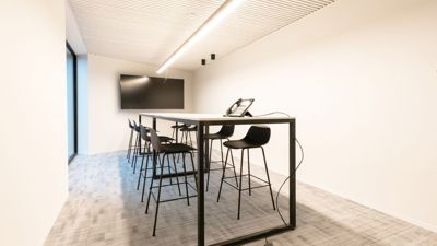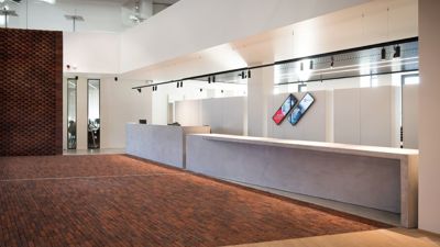 In de inkomhal komt de bezoeker eveneens in aanraking met een digitaal snufje. “Een uit de kluiten gewassen touchscreen toont de volledige site en alle medewerkers. Als je een medewerker aanklikt krijg je meteen zijn foto en functie binnen het bedrijf te zien. Handig als je een afspraak hebt met iemand die je nog niet kent. Bovendien kleven we zo letterlijk een gezicht op de sterkhouders van het bedrijf: onze medewerkers.”