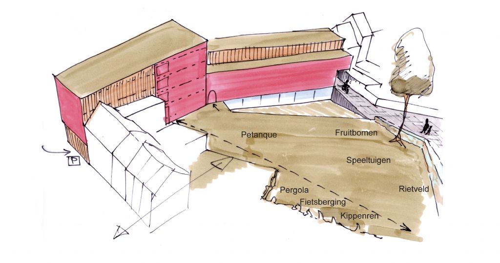 Het gebouw is een flexibele structuur (voornamelijk houtskelet) die casco afgewerkt wordt. Vervolgens kunnen de eigenaars elke unit naar eigen smaak afwerken. Enkel de technieken, zoals hernieuwbare energie en waterrecuperatie, zijn gemeenschappelijk. DAM Architecten: “Om zoveel mogelijk groen te bewaren is de gemeenschapsruimte, net als de parking, ondergronds gesitueerd. Deze is volledig beglaasd en geeft via een talud (schuif af, amfitheater) uit op het groene binnengebied. Daar komt dan speelruimte, een moestuin, fruitbomen…”