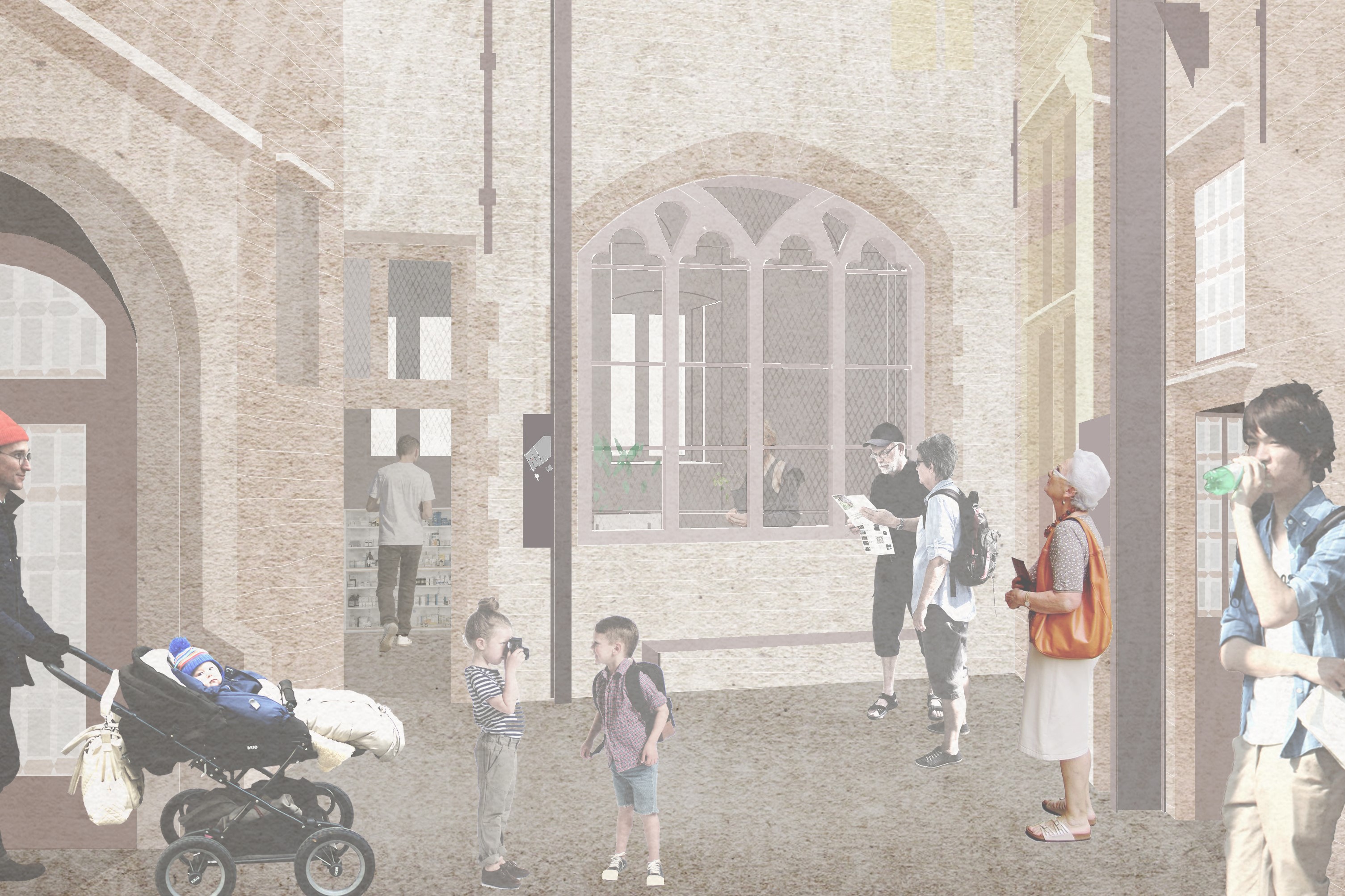 Binnenin werd de volledige benedenverdieping opgevat als een doorwaadbare ontvangstzone, met één centrale balie die verschillende functies bediende: van ticketing tot stadswinkel. De historische kamers rond de binnenkoer kregen een flexibele invulling als kinderhoek, projectieruimte of spreekkamer. Door hun opzet konden deze ruimtes eenvoudig worden aangepast aan veranderende noden of tijdelijke tentoonstellingen.