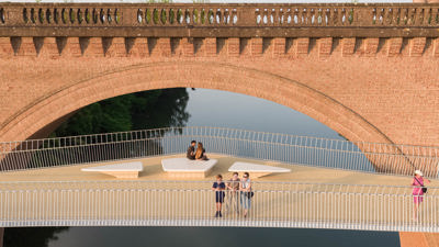 Er vindt een subtiele dialoog plaats tussen het compacte, uniforme baksteen van het viaduct en de lichtheid en materialiteit van de voetgangersbrug. De dialoog versterkt beide structuren en vormt een samenhangend nieuw geheel dat de inwoners van Albi al een week na de voltooiing omarmen.