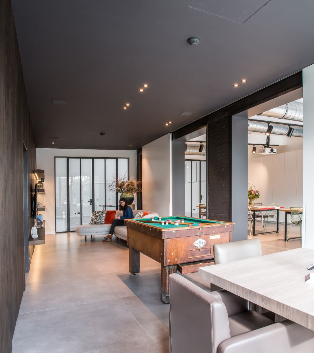 Vanuit de idee dat ‘teamrendement’ begint bij het gebouw werd centraal in het pand een ‘meeting point’ voor gasten en medewerkers voorzien en werd een multifunctionele lunch-, multimedia- en vergaderruimte geïnstalleerd geflankeerd door een sportzaal en een ontspannende ‘inspiratieruimte’. De achterliggende zongerichte en charmant ommuurde tuin wordt gelinkt aan deze ruimtes en hierdoor geactiveerd.
