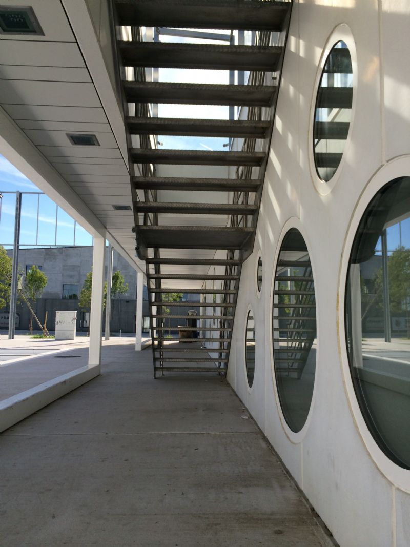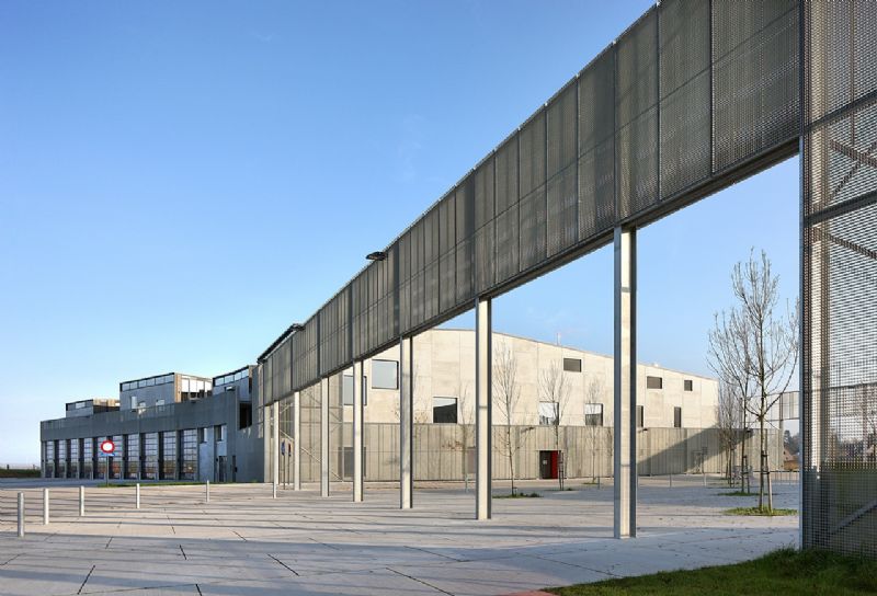 Het complex vormt niet enkel een samenhangend geheel door de wisselwerking tussen de landvorm en de architecturale uitwerking van de individuele gebouwen, maar ook door het materiaalgebruik. De landvorm wordt omhuld door een schil die bestaat uit transparante stalen roosters. Deze vormen zowel een functionele afsluiting als een visueel verbindend element dat integreert met het omliggende landschap door zijn schaal en transparantie.