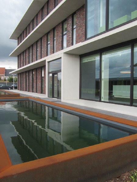 Bij de buitenaanleg werd een groene zone voorzien als buffer tussen de kantoren en de parking en loskades. In deze groene buffer werd een langgerekte vijver aangelegd, waarvan de opstaande boorden zijn bekleed met Cortenstaal.