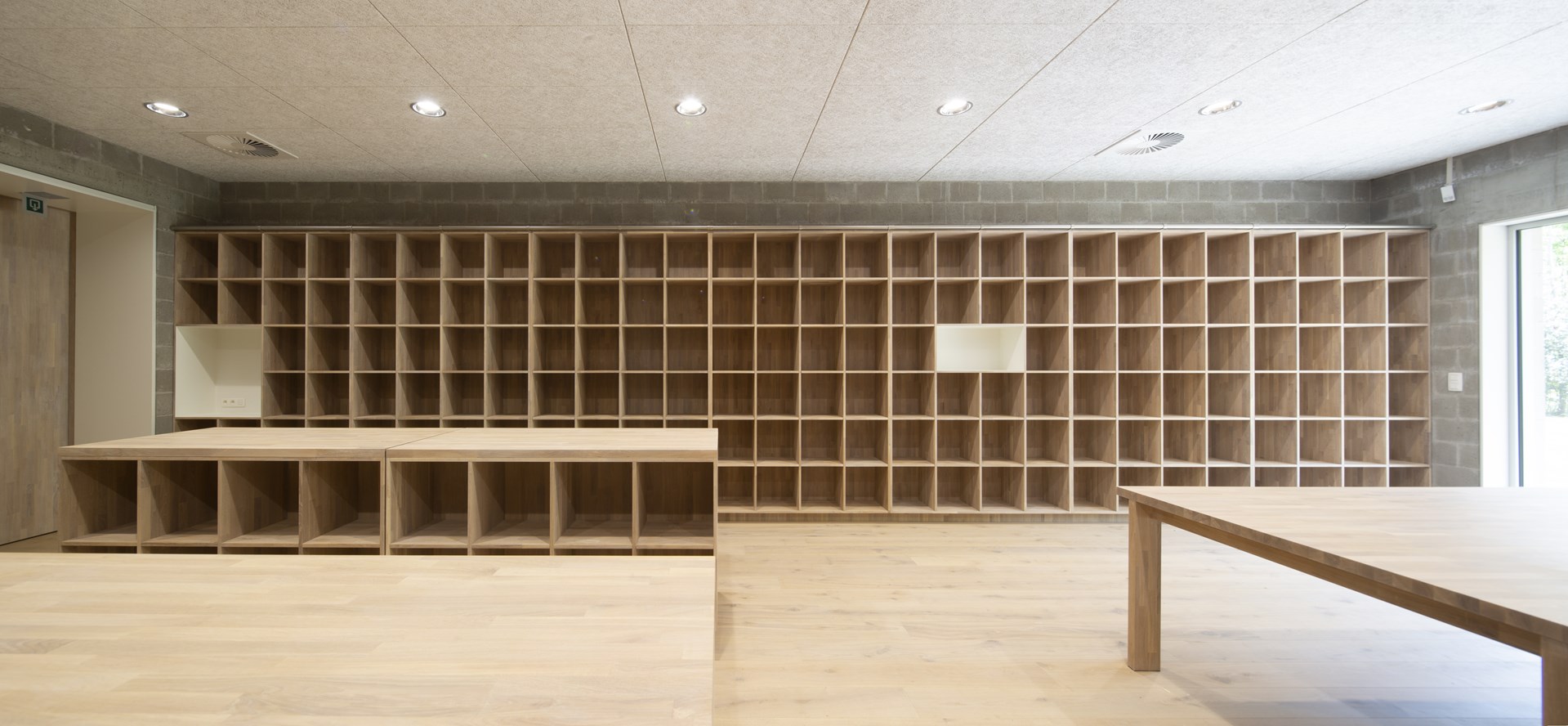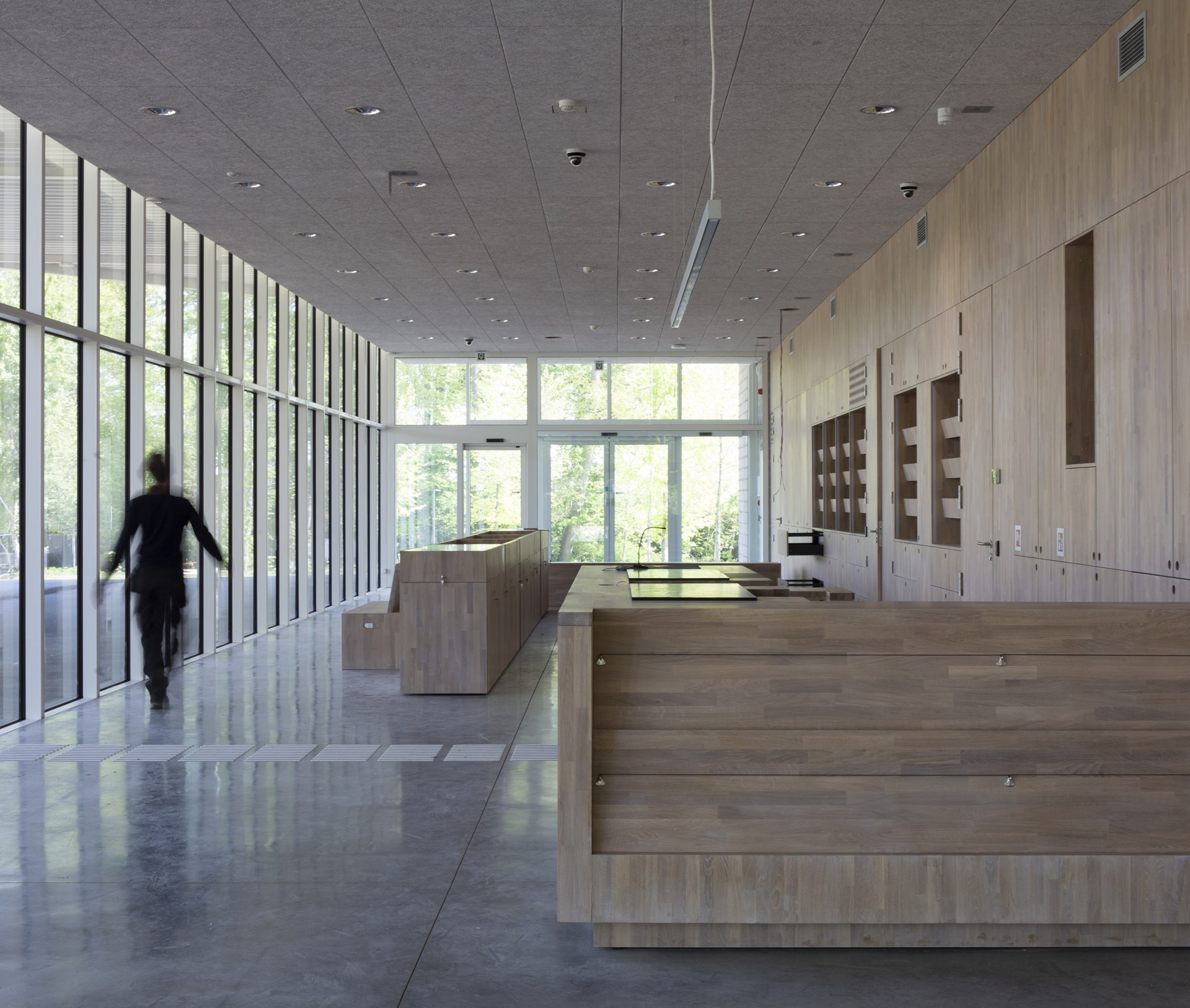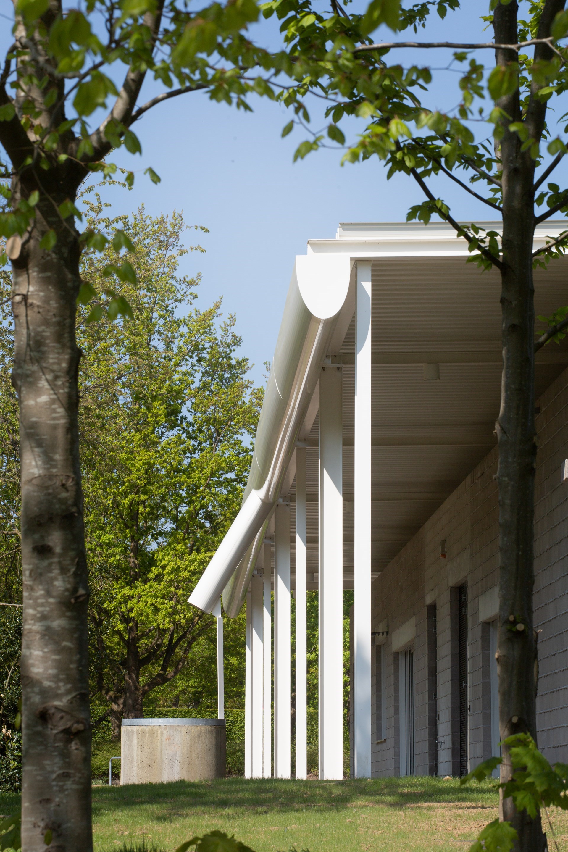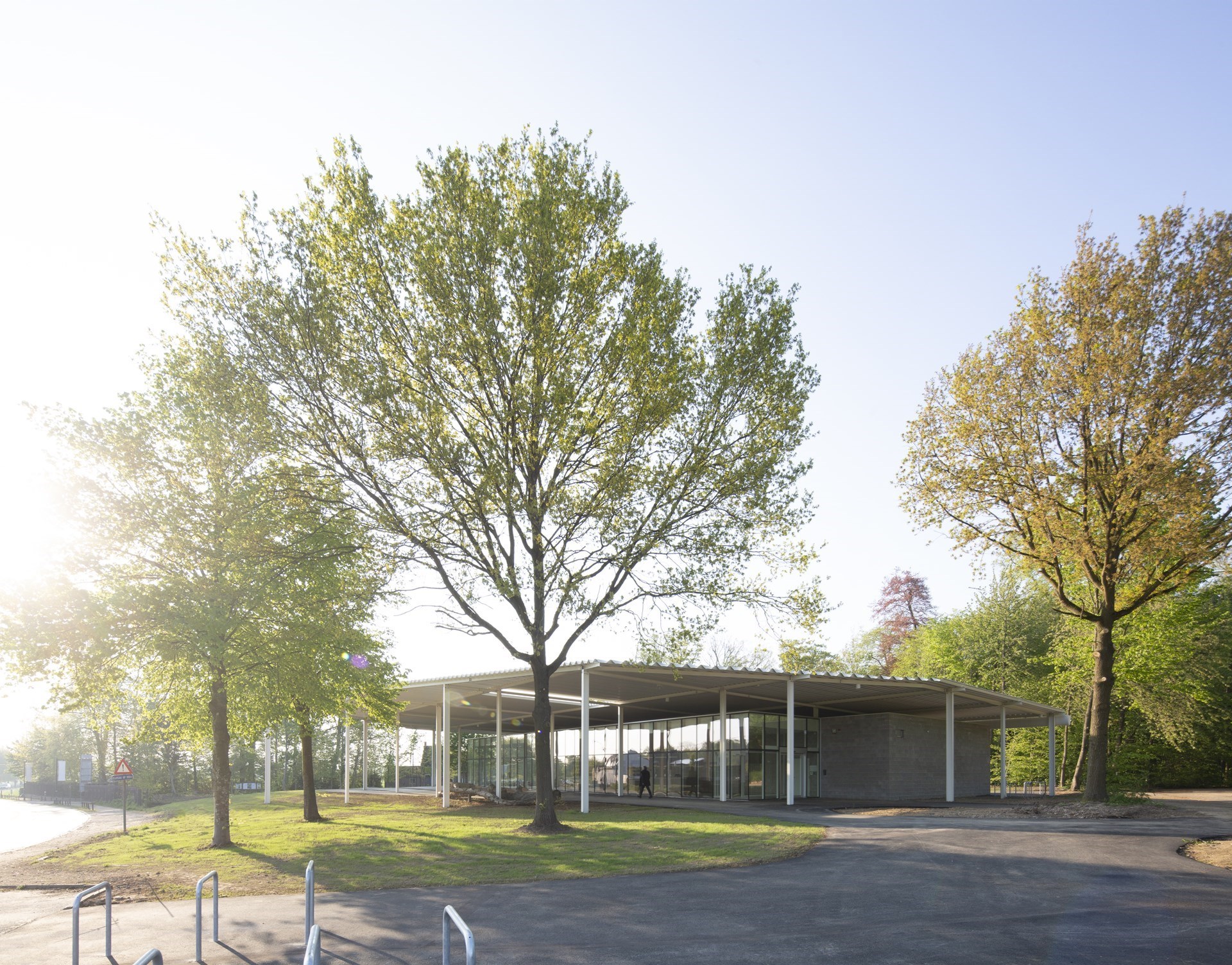 Het onthaalpaviljoen heeft bewust niet eenzelfde status als het kasteel of de historische gebouwen in het park maar gedraagt zich haast nederig en functioneel, als een ‘gereedschap’ ten dienste aan het domein. Nederig, maar daarom niet minder krachtig. Een architecturaal statement dat ruwheid met elegantie combineert, zowel in de materiaalkeuze, waarin beton, glas, hout en metaal domineren, als op vlak van visuele uitstraling.