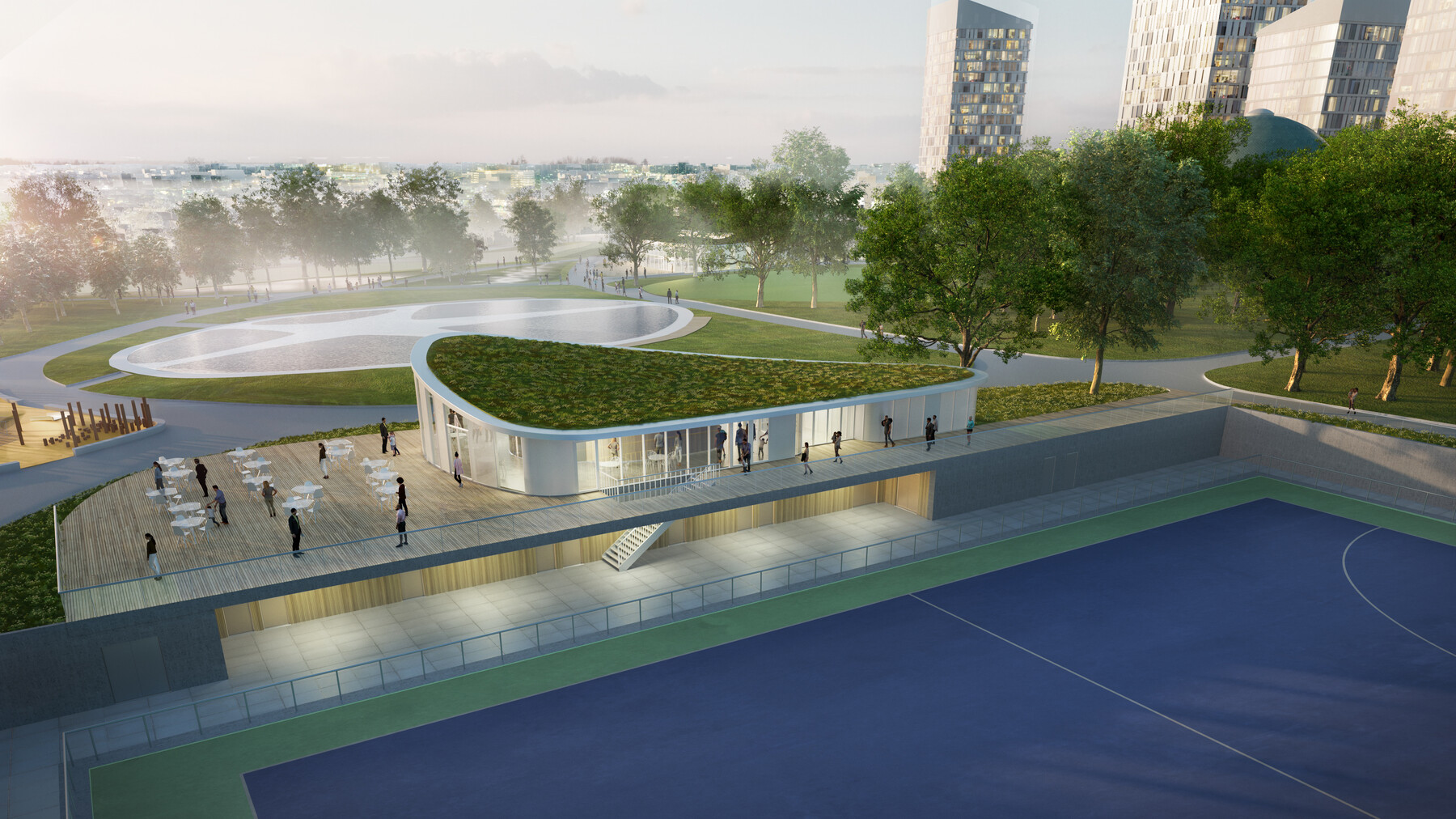 Daarnaast komt er ook een grand café met een schitterend uitzicht op het park. Daarmee biedt het complex voor zowel sporters als parkbezoekers variatie en een veelzijdige ervaring. Onder het park wordt een parkeergarage voor auto’s en fietsen gerealiseerd.