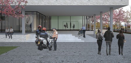 De gewenste footprint van het nieuwe politiecommisariaat impliceert een compact volume waarin het zware programma logisch wordt opgenomen. De pleinwerking die het gebouw genereert, wordt aangegrepen om er het pub-lieke programmagedeelte aan te koppelen. Het onthaal wordt zo voorafgegaan door een laagdrempelige inkomplaza ingebed in het openbaar domein. Zo kan dit bescheiden maar bijzonder belangrijke programmaonderdeel duidelijk herkenbaar blijven tussen de vele kantoren en niet publieke functies.Op die manier levert het gebouw een waardevolle bijdrage aan het bepalen van een leesbare identiteit van de plek.