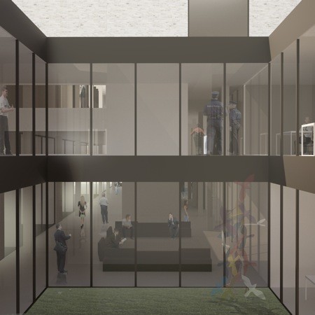 Het kiezen voor een compacte volumetrie maakt een doordacht schakelen en efficiënt ruimtegebruik noodzakelijk. Daarbij moet vermeden worden dat ruimtelijkheid en programmatorische relaties onder druk komen te staan. In het wedstrijdvoorstel worden daarom alle programmaonderdelen die een ruimere vrije hoogte vereisen geclusterd. Een specifieke werking tussen deze geclusterde ruimtes en de overige onderdelen wordt mogelijk door het aanwenden van split-levels. Een rustige maar continue variatie in ruimtelijkheid is het gevolg ervan. Onverwachte zichten, verrassende doorkijken en zichtlijnen verlenen het totale gebouw een hedendaags karakter, een milde spanning die anticipeert op anonimiteit.