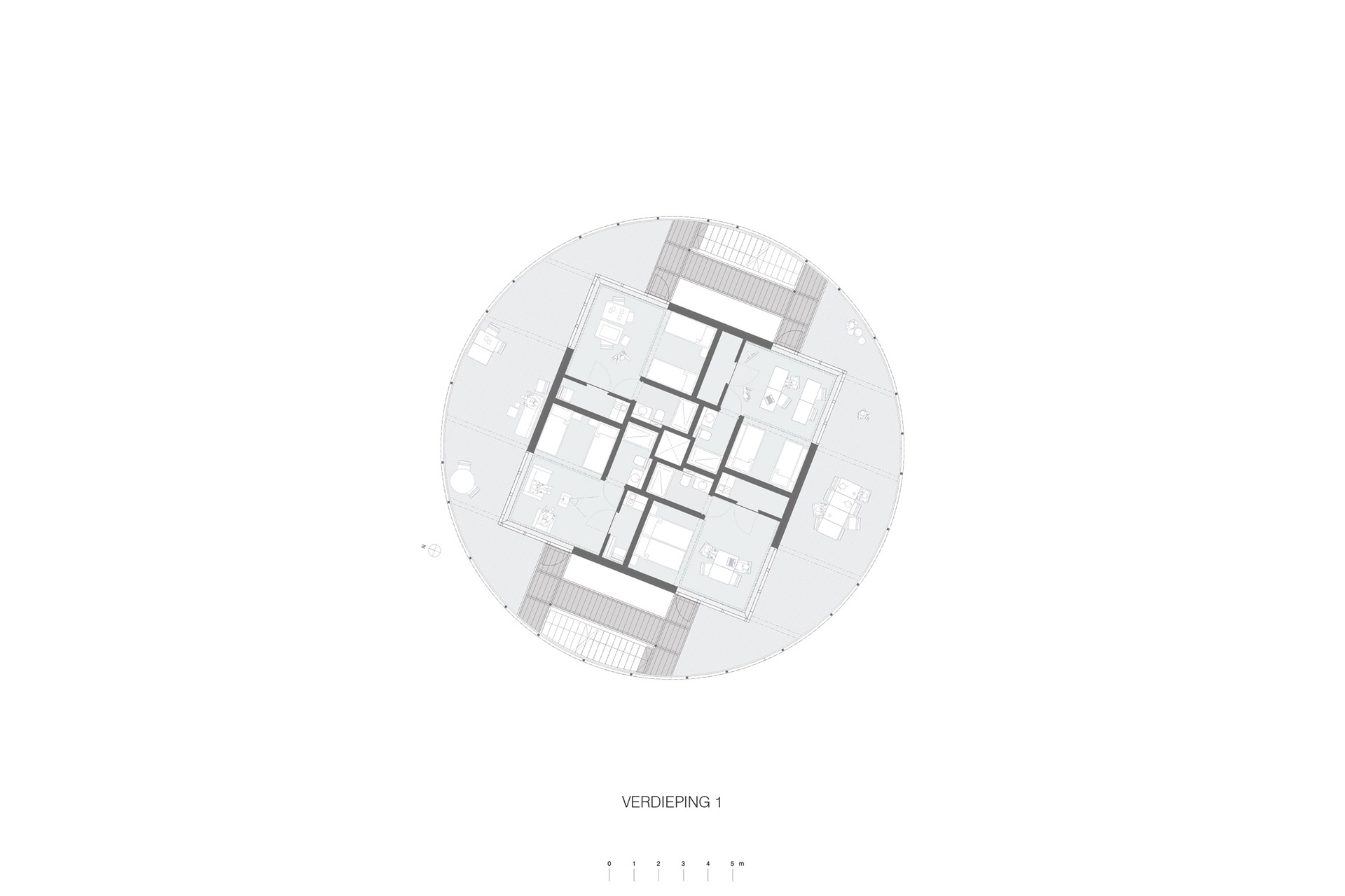 Dit traject resulteerde in het ontwerp van een residentiegebouw dat langs een nieuw meanderend pad de verbinding zal vormen tussen vier andere cirkelvormige gebouwen. Door andere beschaduwing, beplanting en inrichting ontstaan rond het gebouw unieke verpoosplekken die bereikbaar zijn vanuit de collectieve keuken en leefruimte.