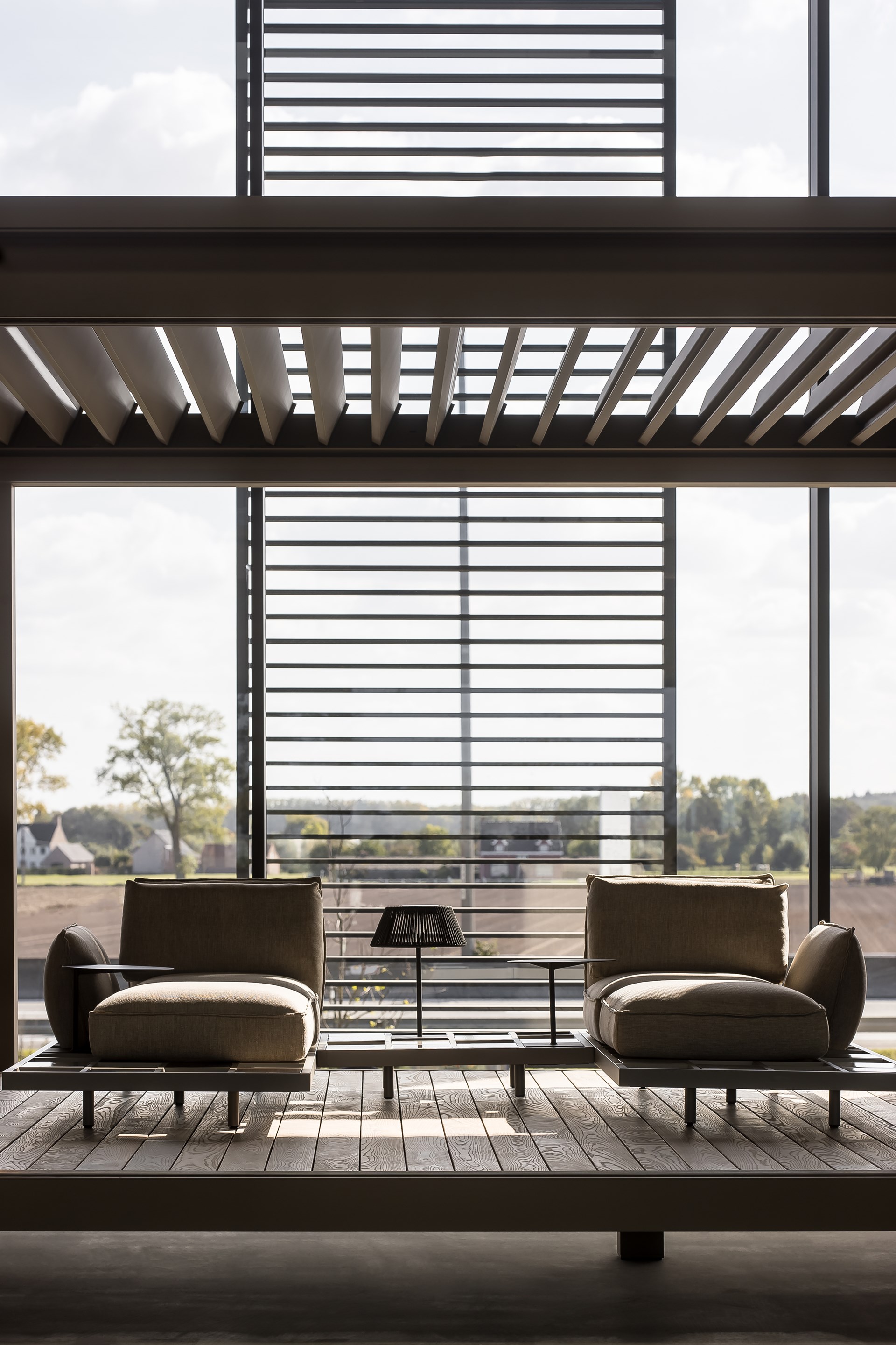 In deze nieuwe outdoor productiesite worden voortaan ook alle Renson buitenproducten voor wereldwijde export gemaakt. Van terrasoverkappingen, carports en alle bijbehorende accessoires zoals verlichting, schuifpanelen, plantenbakken, zitbanken en andere design tuinelementen: de nieuwe productiesite kan een capaciteit aan die 3 keer groter is dan wat voorheen aan outdoor living geproduceerd kon worden in Waregem. Uiteraard gaat er nog meer schuil achter de indrukwekkende gevel van 380 meter langs de autosnelweg. Naast de productie vind je er namelijk ook een Renson-testcentrum en trainingsfaciliteiten, allemaal van de hand van Embo Architecten. Binst Architects nam de kantoren, het NOA outdoor living experience center en ‘landmark’ voor zijn rekening.