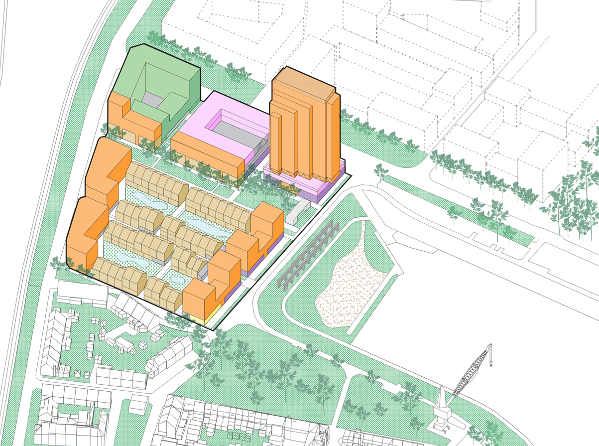De nieuwe wijk zet in op sociale diversiteit door minstens 40 procent van de ongeveer 400 woningen te reserveren voor sociale huur en budgethuur. Deze woningen zijn bedoeld voor huurders met een bescheiden inkomen die op de private markt moeilijk een kwalitatieve woning vinden. De bebouwing wordt strategisch verdeeld over de site om aan te sluiten bij de omgeving. Aan de kant van de Muide komen lagere gebouwen die qua schaal passen bij de bestaande huizen in de wijk. Richting de Chinastraat, de spoorweg en de kade worden hogere volumes opgetrokken, waaronder een woontoren met een hoogte van 80 meter. Het programma omvat naast de reguliere woningen ook studentenkamers, commerciële ruimtes en kantoren.