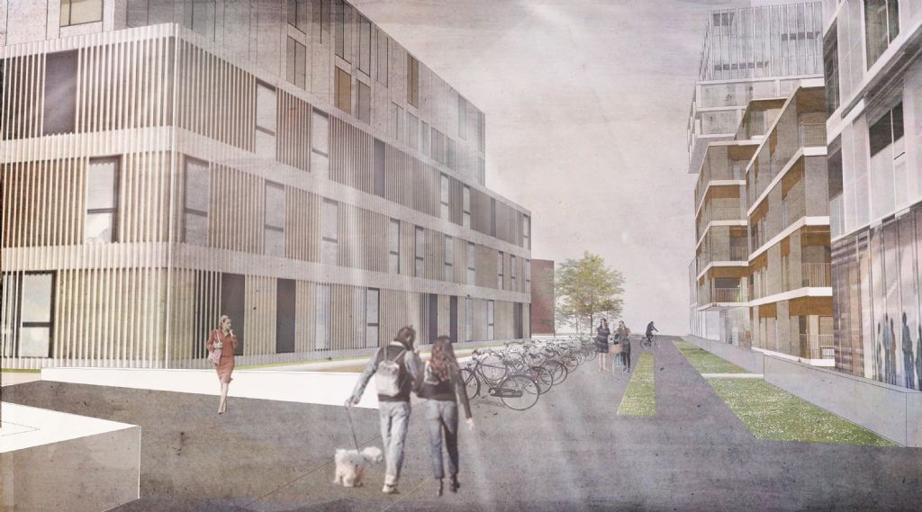 Het masterplan plaatste de architecten ook voor enkele uitdagingen. “Het gaat om een dense ontwikkeling met grote transparantie waar we groene ruimte introduceren voor de hele buurt”, zegt Luc Reyn. “We hebben een bovenlokale fietsverbinding noord-zuid opgenomen in het masterplan en een autoluwe woonwijk aangelegd zonder straten. Het was ook een uitdaging om het kanaal zichtbaar maken vanaf de Vesten. Tevens was het van belang om de kwalitatieve ondergrondse bereikbaarheid van de verschillende gebouwen te garanderen.”