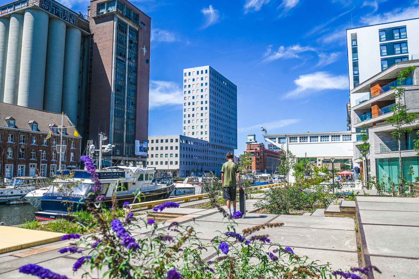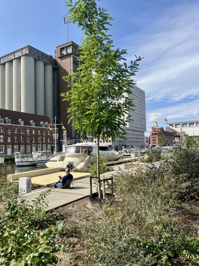 De materialiteit en sfeer zijn afgestemd op het industriële verleden van de site. Robuuste elementen zoals kranen, kademuren en bakstenen gebouwen blijven behouden en worden gecombineerd met nieuwe ingrepen in hout en groen. Zo ontstaat een harmonieus geheel dat geschiedenis en toekomst verbindt. Het ontwerp slaagt erin om ruwe erfgoedelementen niet alleen te behouden, maar ze ook een nieuwe functie te geven binnen een hedendaags stadslandschap.