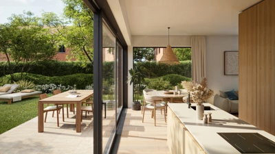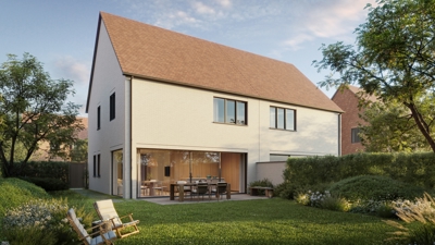 De landschappelijke ruimte — met waterpartijen, bloeiende vegetatie, speelzones en wandelpaden — is geen restzone maar wordt expliciet als collectieve kamer ontworpen. Ze verbindt de individuele woningen en creëert een zachte overgang tussen privé en publiek domein. Elke woning beschikt over een eigen tuin van 80 tot 500 m², maar de interactie met het gemeenschappelijk groen is minstens zo belangrijk. Door de oriëntatie en spreiding van de bebouwing krijgt het park ruimte en lucht, zonder dat de woonkwaliteit aan privacy inboet.