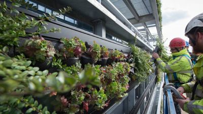 De plantenwand is opgebouwd uit het modulaire LivePanel-systeem van Mobilane, leverancier van innovatieve groensystemen. De groene wand is niet grondgebonden en bevat in totaal 11.000 verwisselbare plantcassettes. Elke rij met cassettes wordt in een aluminium gootprofiel geplaatst dat tevens dient als waterbuffer. De planten in de cassettes worden automatisch van water voorzien door een capillair watergeefsysteem dat wordt aangestuurd door sensoren in de wand. Het innovatieve systeem is onderhoudsarm, lekvrij en ongevoelig voor storingen. Bij ontmanteling is de plantenwand volledig recyclebaar.