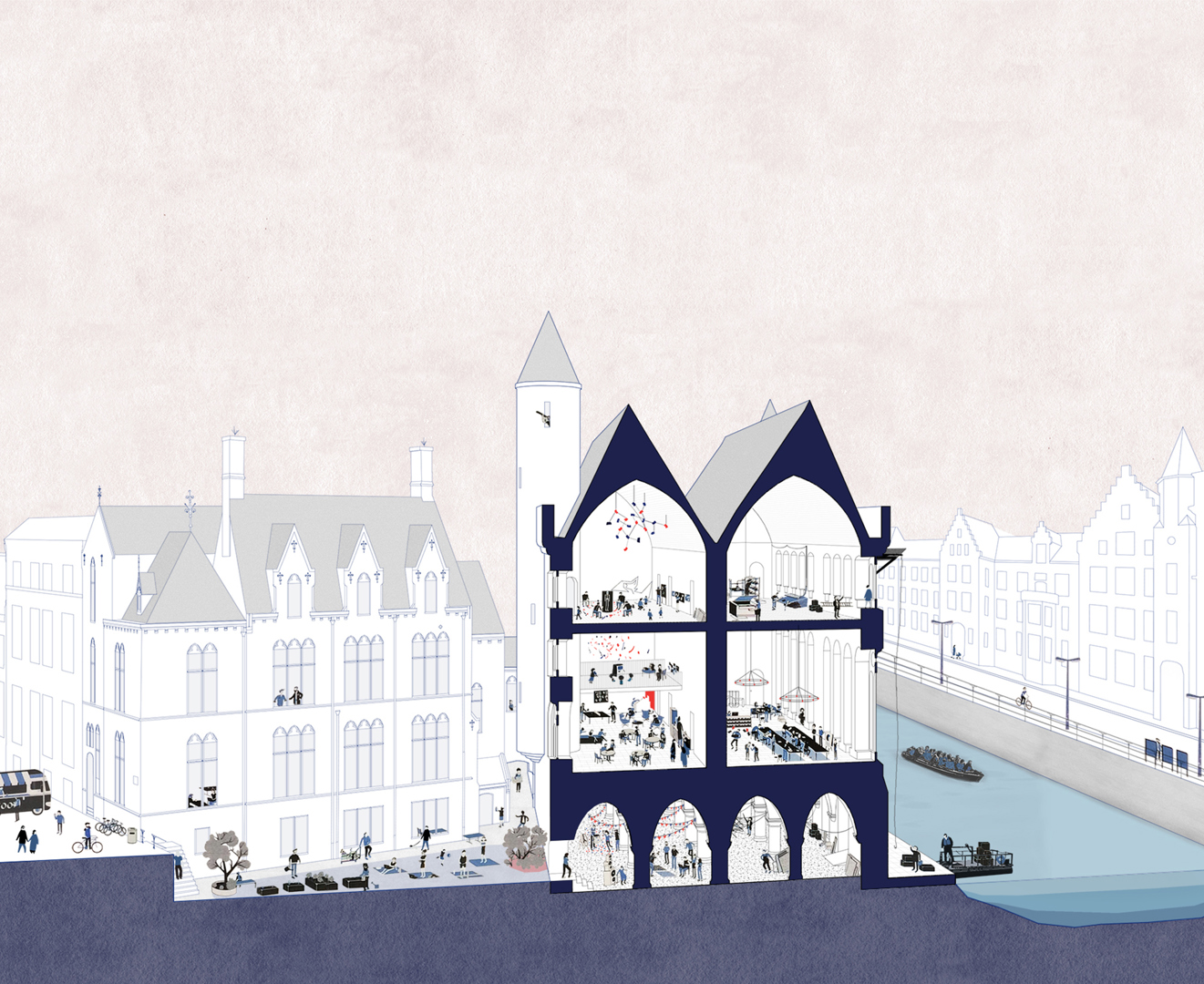 De hedendaagse ingrepen zijn bewust terughoudend en precies geplaatst. Waar historische vloeren ontbreken, wordt een nieuwe houten verdieping toegevoegd, aansluitend bij een niet-uitgevoerde ontwerpintentie van Verhaegen. Bestaande elementen krijgen een tweede leven, zoals theatermeubilair dat wordt opgebouwd uit voormalige archiefrekken. Ook de kade aan de Schelde wordt opnieuw ingericht en publiek leesbaar gemaakt, als onderdeel van de relatie tussen gebouw en stad.