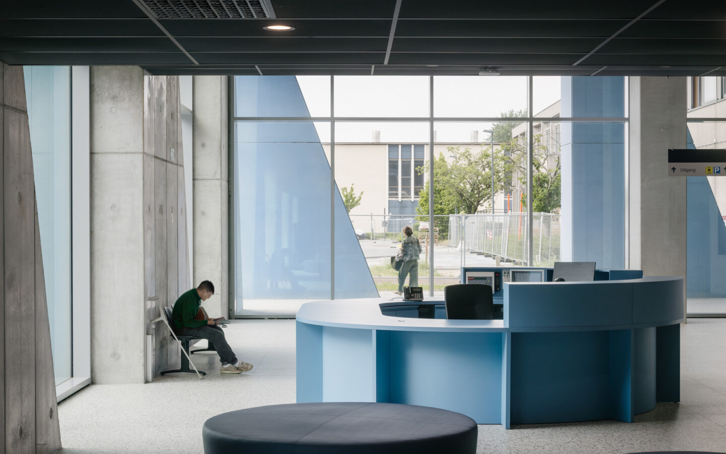Het resultaat is een gebouw dat technisch vooruitstrevend én architecturaal overtuigend is. De ranke verticale geleding van de gevel benadrukt de hoogte en geeft het geheel een lichte, bijna etherische uitstraling. De colonnades aan de inkomzone en de patio creëren een open, uitnodigende sfeer en sluiten naadloos aan op de toekomstige uitbreidingen van de campus. “Een gebouw ontwerpen waarbij vooraf grotendeels onbekend is wat erin komt, en dat ook nog een landmark moet worden — dat doe je niet vaak,” zegt Tim Loeters, partner-architect bij Wiegerinck. “Maar het is meer dan gelukt.”