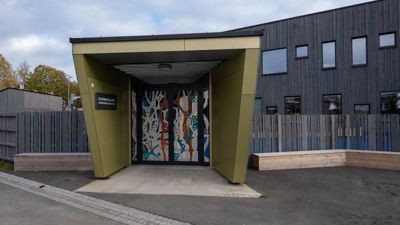 Alle ingangen zijn overdekt. Twee van deze ingangen zijn bovendien uiterst teruggetrokken ingeplant, een keuze die voortvloeide uit het plaatselijke klimaat. Tussen november 2019 en april 2020 viel er maar liefst 6,5 meter sneeuw in Tromsø! Een andere ingang is uitgerust met een luifel die zich uitstrekt tot aan de parking. Dit zorgt ervoor dat rolstoelgebruikers het gebouw kunnen bereiken zonder te worden blootgesteld aan weer en wind. Alle ingangen zijn bekleed met geventileerde Trespa® Meteon®-platen. De luifel die de school verbindt met de parking springt uit de band dankzij driehoekige en trapezoïdale steunelementen in hetzelfde materiaal.