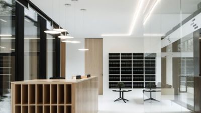 Het interieurconcept van het notariaat diende een minimalistische eenvoud en rust uit te stralen, wat gerealiseerd werd door als hoofdkleur wit te gebruiken. De witte gietvloer creëert, in combinatie met accenten in essenhout, de verdiepingshoge deuren en het elegante meubilair, de juiste sfeer.