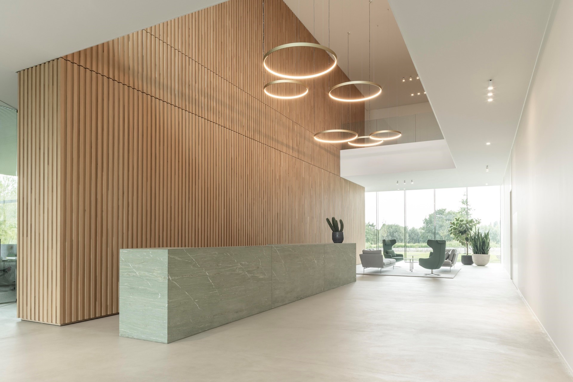 En snelheid haalt ook Damiaan Vanhoutte aan als een van de grote voordelen. “Zeker voor bedrijfsgebouwen, kantoren, loodsen … is prefab beton uitermate geschikt omwille van de snelle bouwtijd. En binnen dat verhaal denken wij graag ruimer, vandaar de keuze voor de verticaliteit en wit, glad beton. Dit maakt het misschien iets duurder, maar niet veel. De meerkost weegt niet op tegen de architecturale en visuele meerwaarde. En het resultaat wordt zeker gesmaakt. In eerste instantie door de klant zelf, maar ook Stad Kortrijk stimuleert mooie architectuur in bedrijvenzones. Niet alleen de buitenkant, maar ook de binnenkant spreekt tot de verbeelding. Zo is de inkomhal opengetrokken over twee verdiepingen, wat voor een directe ruimtelijke link zorgt met de grote loods die zich rechts van de inkom bevindt. Aan de linkerkant werden de kantoren ondergebracht. Het geheel, zowel binnen- als buitenkant, straalt een zekere klasse uit. Een klasse en kwaliteit die ook Novitan als prominente farmaceutische speler beoogt”