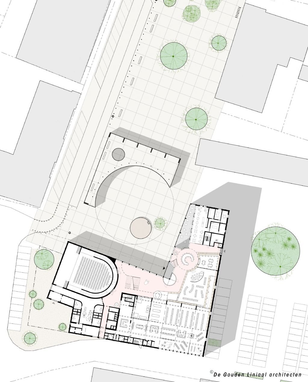 Vanuit de stad Dilsen-Stokkem rees de vraag naar een ontmoetingscentrum dat de bestaande bibliotheek omarmt en een relatie aangaat met het centrumplein. In het nieuwe gebouw dat De Gouden Liniaal Architecten ontwierp, worden de uitbreiding van de bibliotheek, een auditorium voor 280 personen, een muziekacademie, leslokalen voor de naastgelegen humaniora en een horecafunctie ondergebracht.