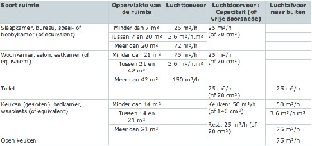 Tabel 1 Vereiste minimum ontwerpdebieten voor elk soort ruimte voor de luchttoevoer, -doorvoer en -afvoer.