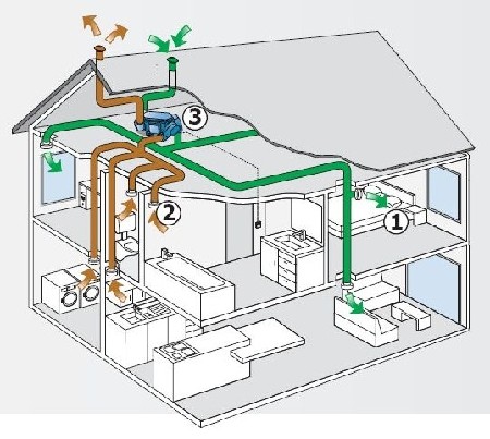 Meestal is het totaal van de vereiste debieten voor de toevoer van verse lucht hoger dan dat voor de afvoer van de vervuilde lucht. Aangezien de lucht in werkelijkheid niet in het gebouw wordt opgeslagen, zal het systeem spontaan naar een evenwicht neigen, afhankelijk van de luchtdichtheid van het gebouw en gekenmerkt door :