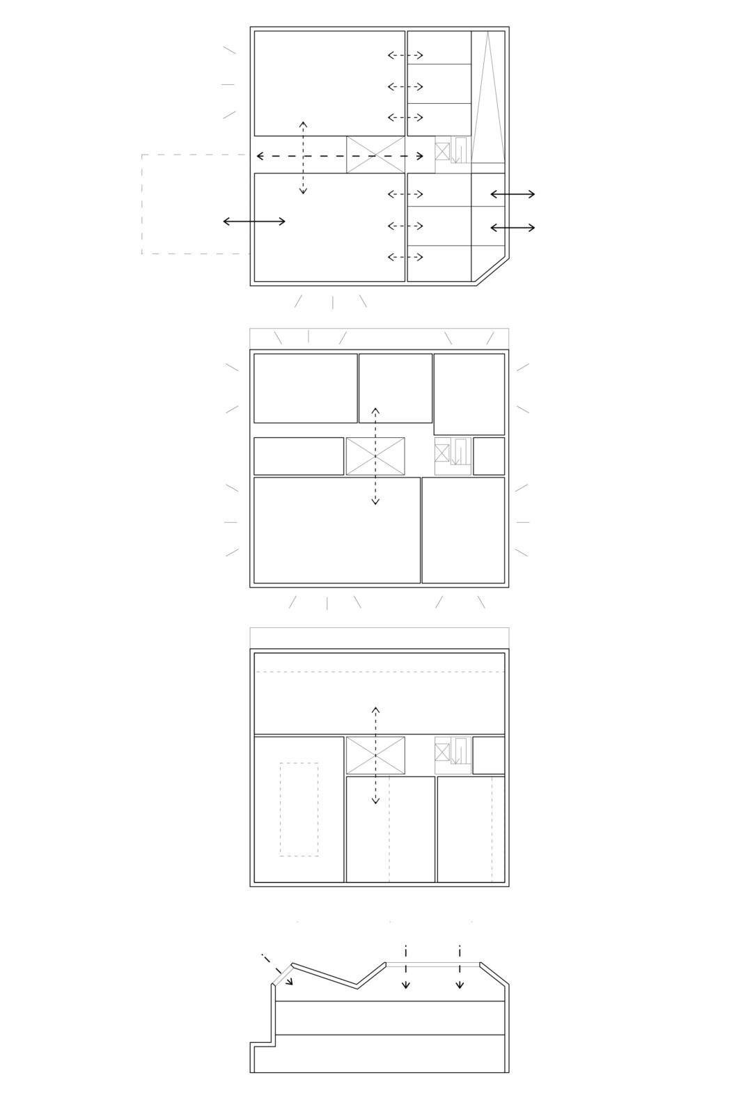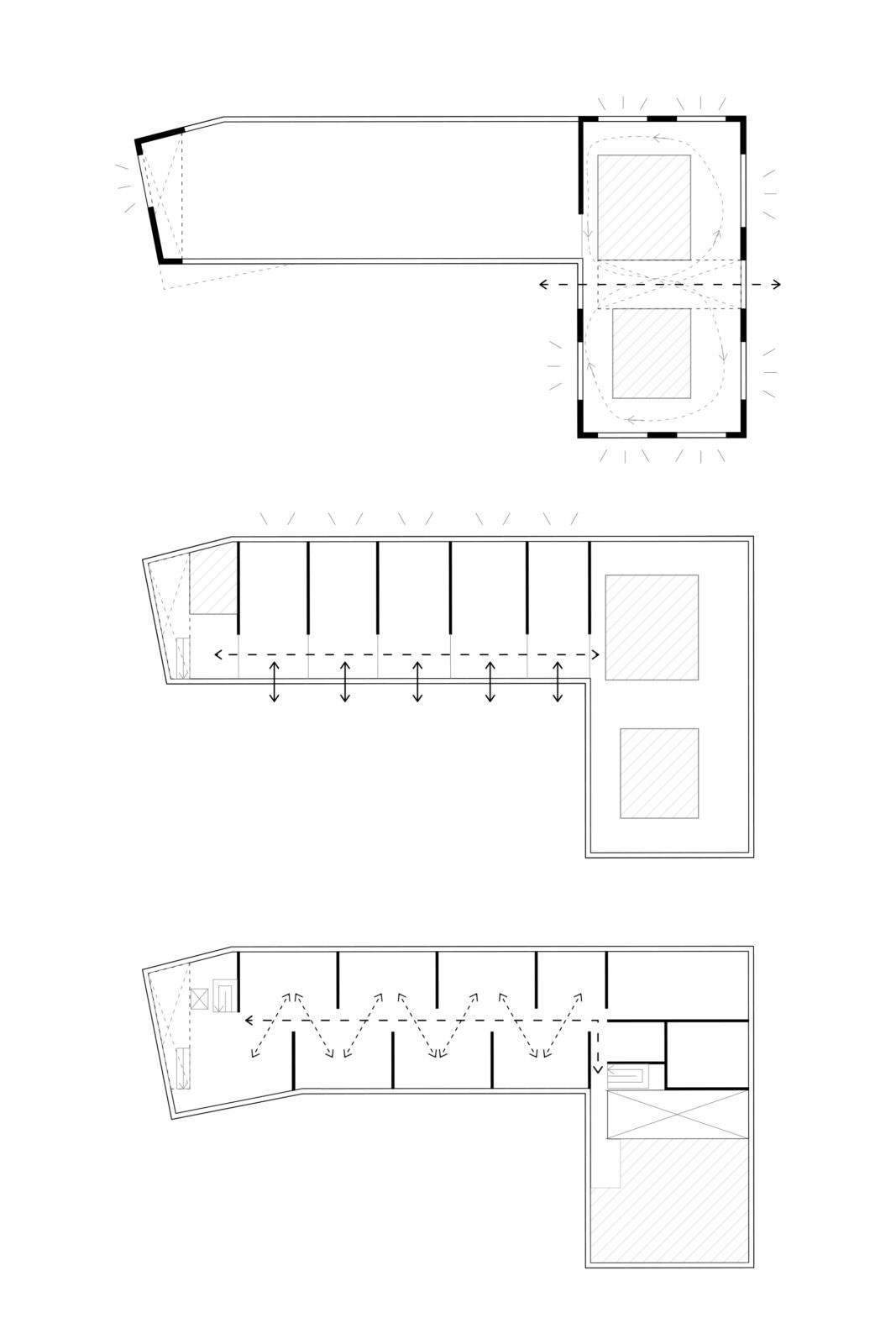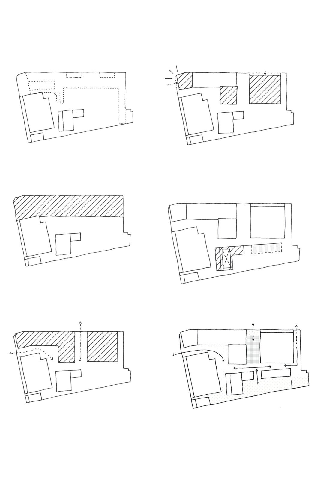 Voor deze ruimtes vonden de ontwerpers inspiratie in de binnenstraten van 19e-eeuwse industriële sites. Deze straten zijn als ruimte eerder het resultaat van de omliggende bebouwing dan omgekeerd en in eerste instantie bedoeld om het bouwblok efficiënt te ontsluiten. Ze bieden echter vaak interessante perspectieven en zorgen voor een boeiende wandeling doorheen het blok. Het nieuwe, meestal postindustriële gebruik van dergelijke sites toont ook hoe deze binnenstraat eenvoudig kan worden toegeëigend kan worden. Grote poorten zorgen voor een directe relatie met het gebouw waardoor een atelier op een mooie dag zijn werkzaamheden deels buiten laat plaats vinden. Tegelijkertijd voorkomt het semipublieke karakter van de straat dat deze volledig privatiseert.