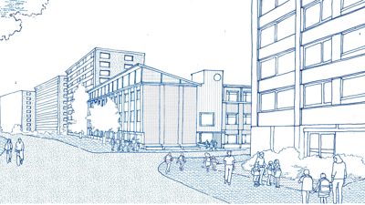 Opmerkelijk aan het ontwerp is de binnenstraat die een variëteit aan buitenruimtes aan elkaar schakelt en de straat een perspectief biedt naar de school. De centrale administratie ligt midden op de site en vormt het hart van de school. De ateliers hebben grote ramen aan de straat, zodat buurtbewoners zicht hebben op de activiteiten in de school.