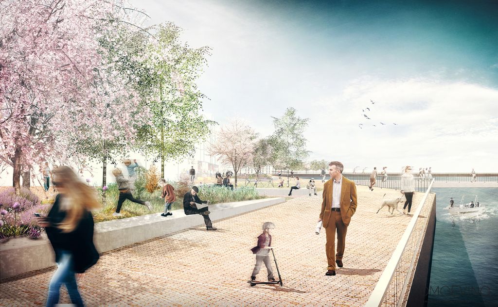 Het ontwerpvoorstel van OMGEVING voor de publieke ruimte rond de nieuwe gebouwen en voor het waterfront streeft naar een maximale groene inrichting. De wandelpromenade langs de rivier Dnipro krijgt groene eilanden met diverse invullingen (terrassen, speellandschappen, bloeiende borders enz.) waardoor een ecologische continuïteit ontstaat. In het noorden loopt de groene promenade uit in een nieuw park.