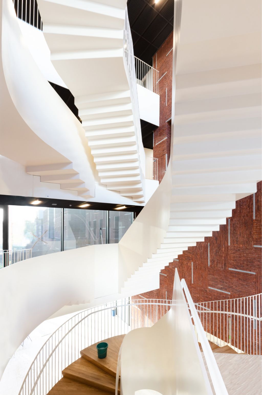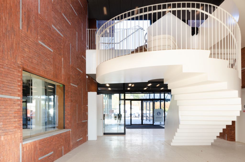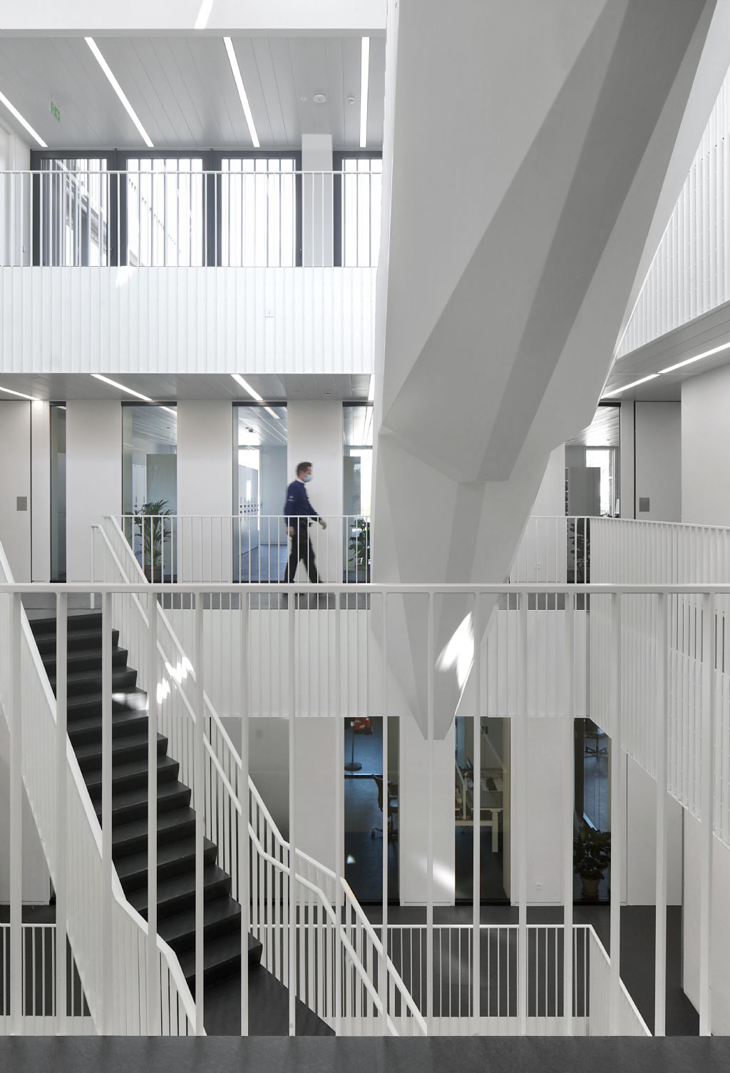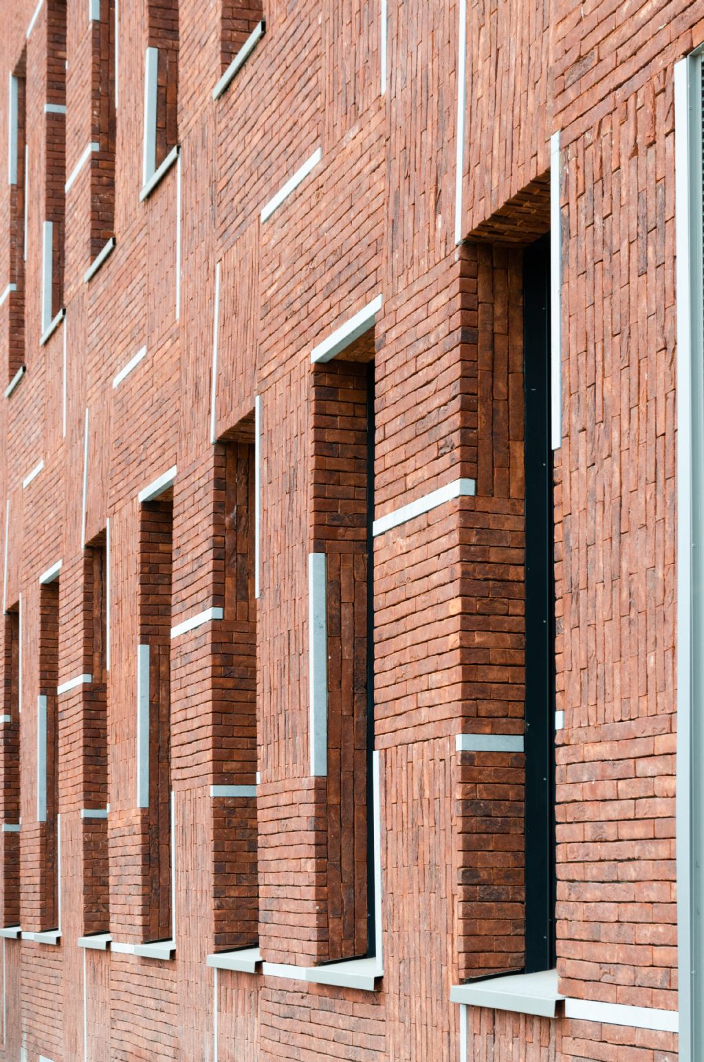 Het gebouw is eenvoudig en goed georganiseerd. De ‘mega-baksteen’ bekleding beantwoordt aan de lokale context: een traditioneel bouwmateriaal toegepast op een niet-traditionele manier. Regelmatig geplaatste verticale ramen passen in het baksteensysteem waardoor voorspelbaar licht de flexibele interne kantoorindelingen kan binnentreden. Uitgespannen metaal (gaaswand) bekleedt de lege ruimten tussen elk volume en contrasteert met de rationele bakstenen gevel. Deze vides definiëren binnenpleinen, brengen daglicht tot diep in het gebouw, moduleren de zonnewarmte en creëren functionele buitenruimtes. Transparante verbindingen tussen de volumes bevatten alle verticale circulatie en gemeenschappelijke ontmoetingsruimten.